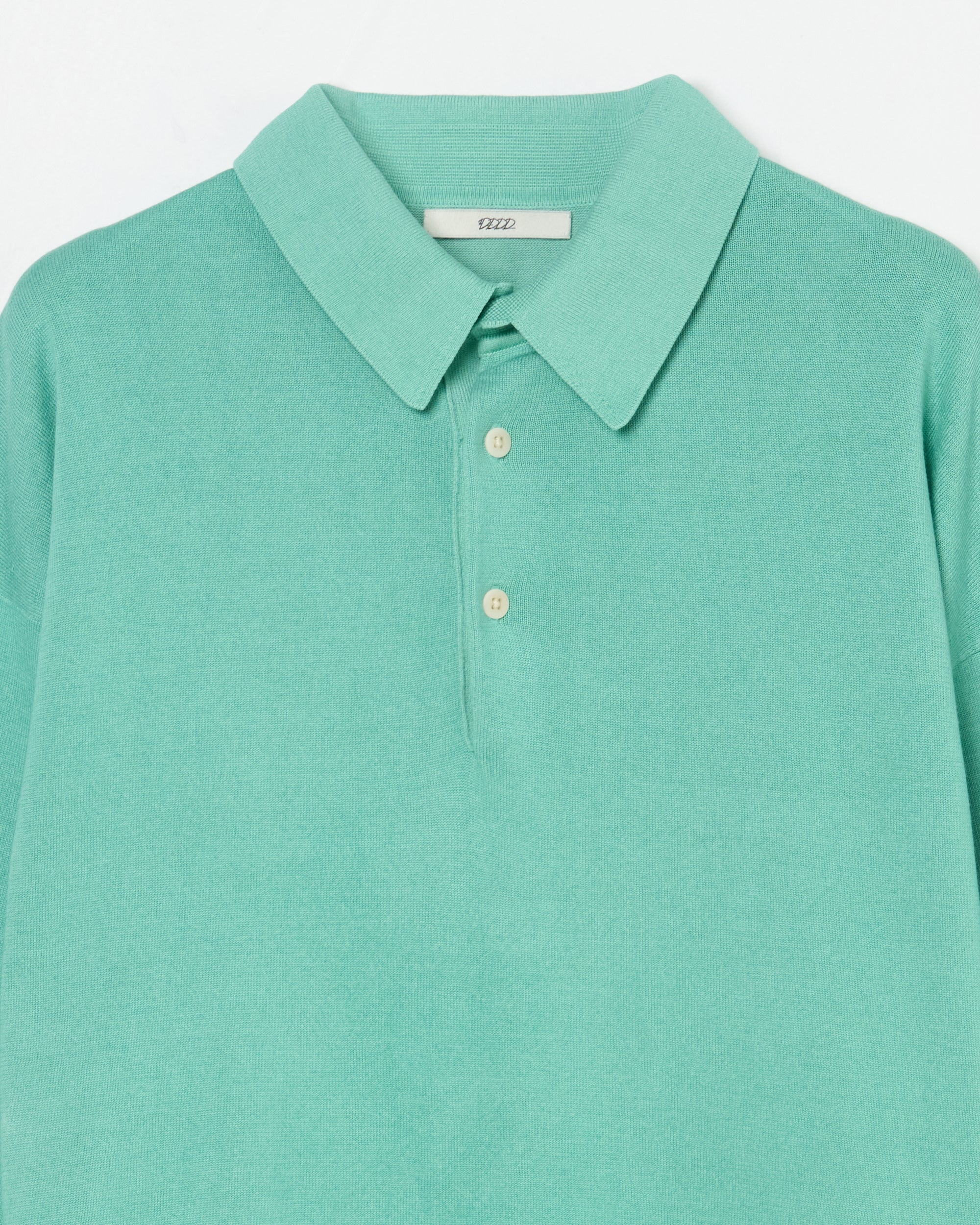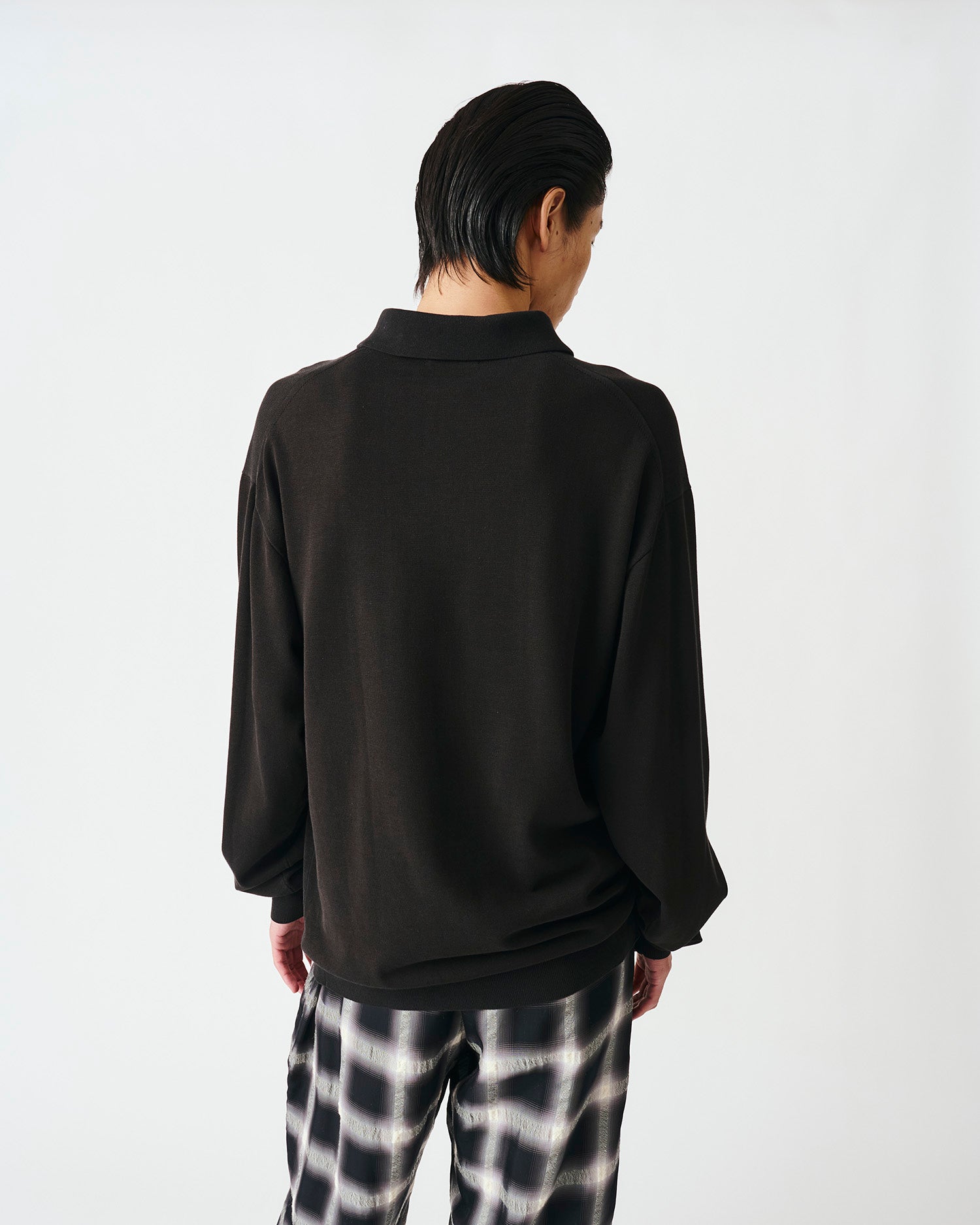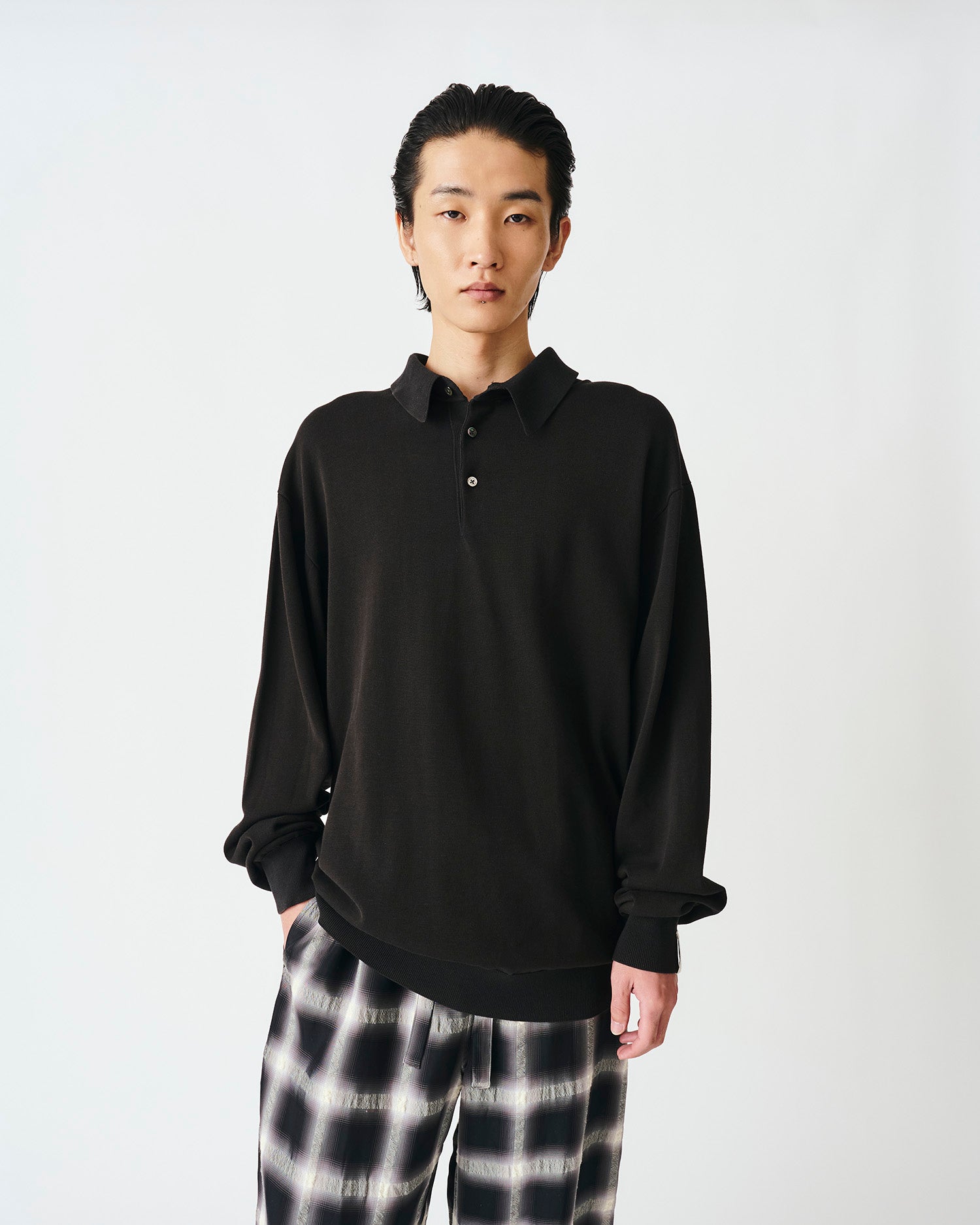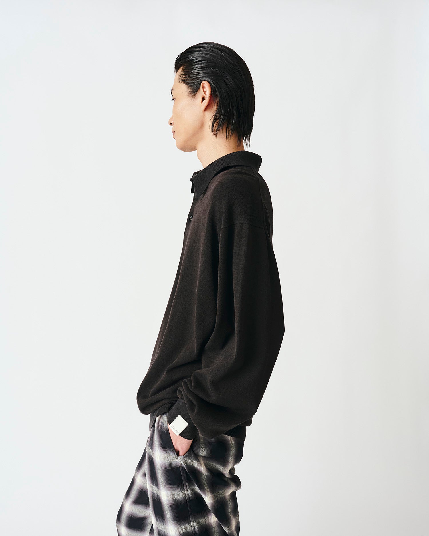 表はシルク、裏はコットン強撚糸を使用し、製品で染めることで独特の色ムラと経年変化を表現しました。表のシルクが光沢感のあるフェード感(フィブリル)と裏の強撚糸が肌離れのよいドライなタッチを演出し清涼感のあるニットに仕上げました。