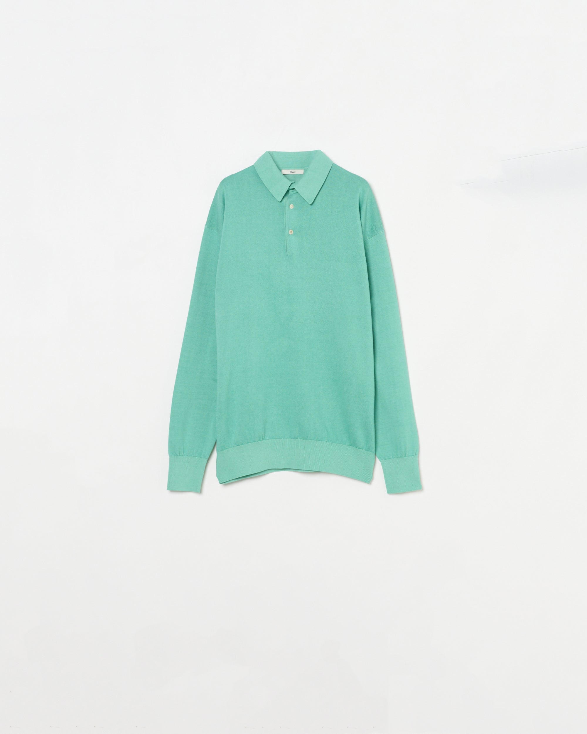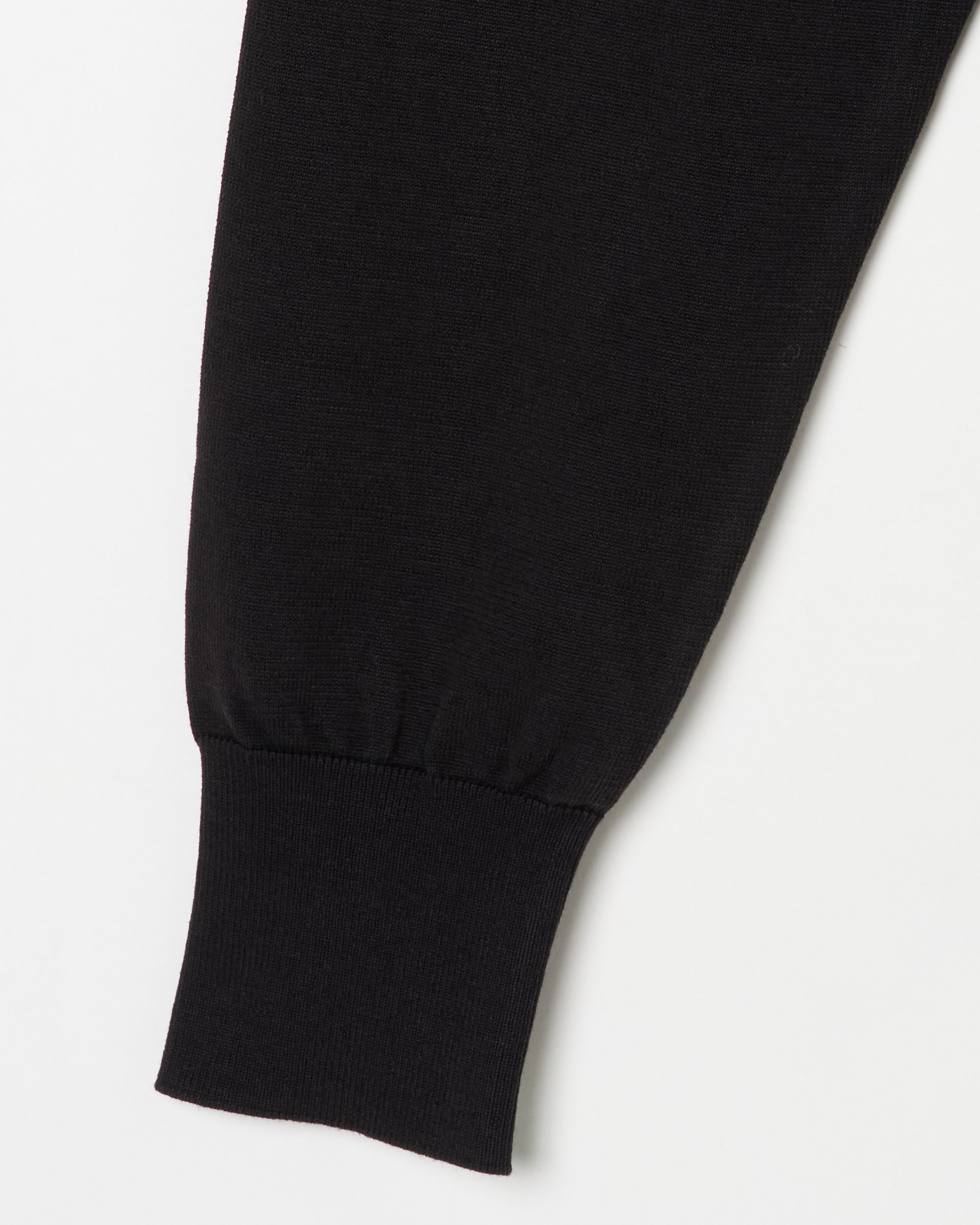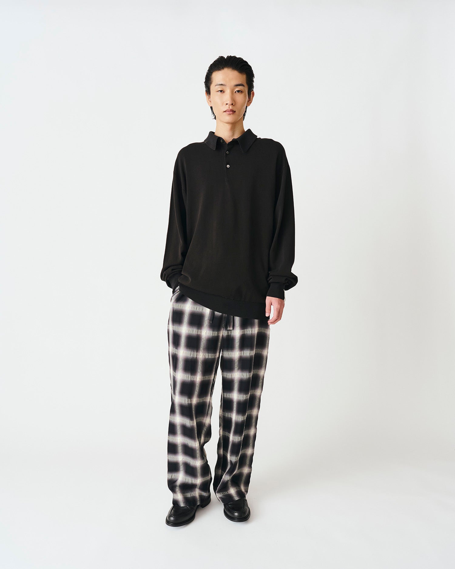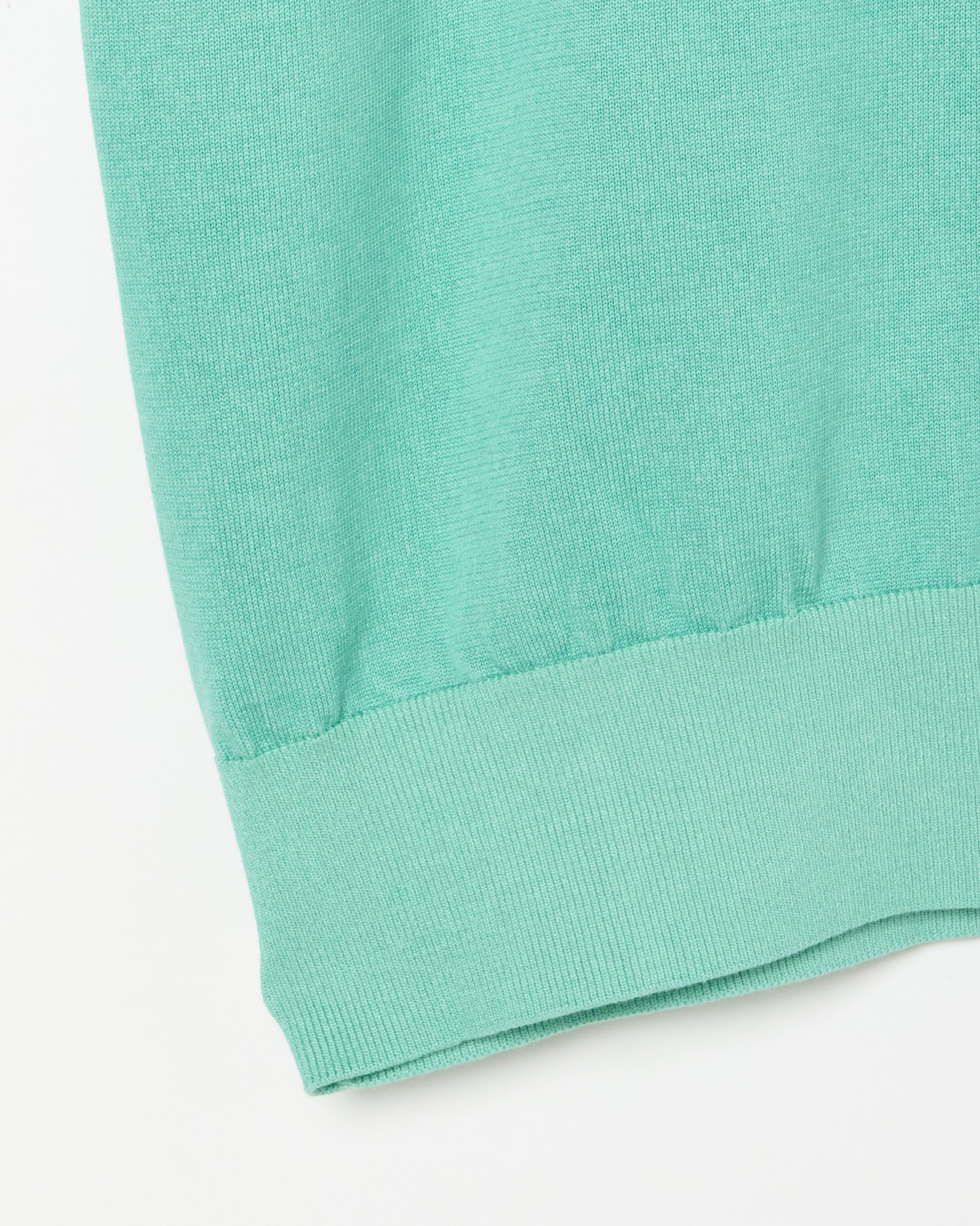 表はシルク、裏はコットン強撚糸を使用し、製品で染めることで独特の色ムラと経年変化を表現しました。表のシルクが光沢感のあるフェード感(フィブリル)と裏の強撚糸が肌離れのよいドライなタッチを演出し清涼感のあるニットに仕上げました。