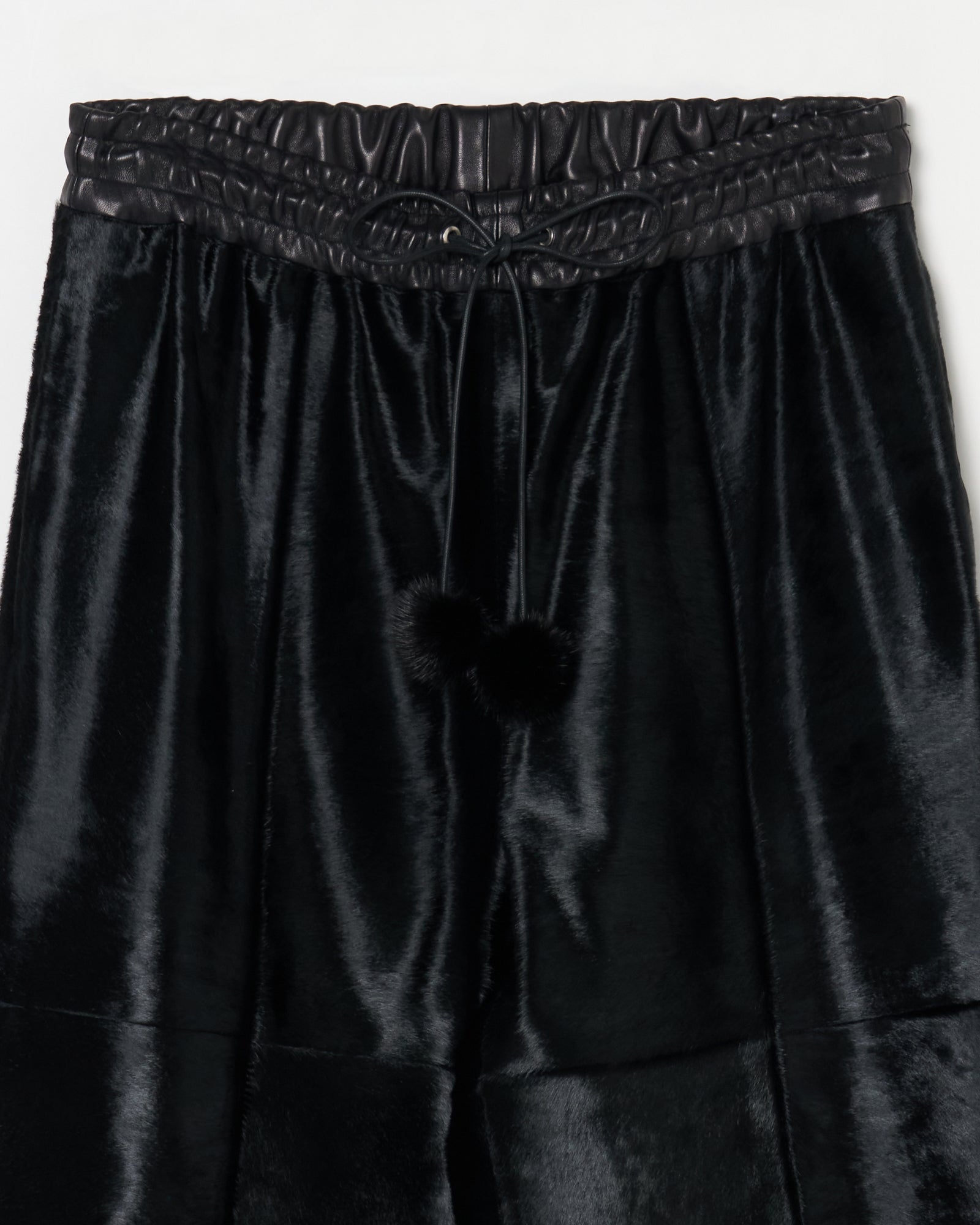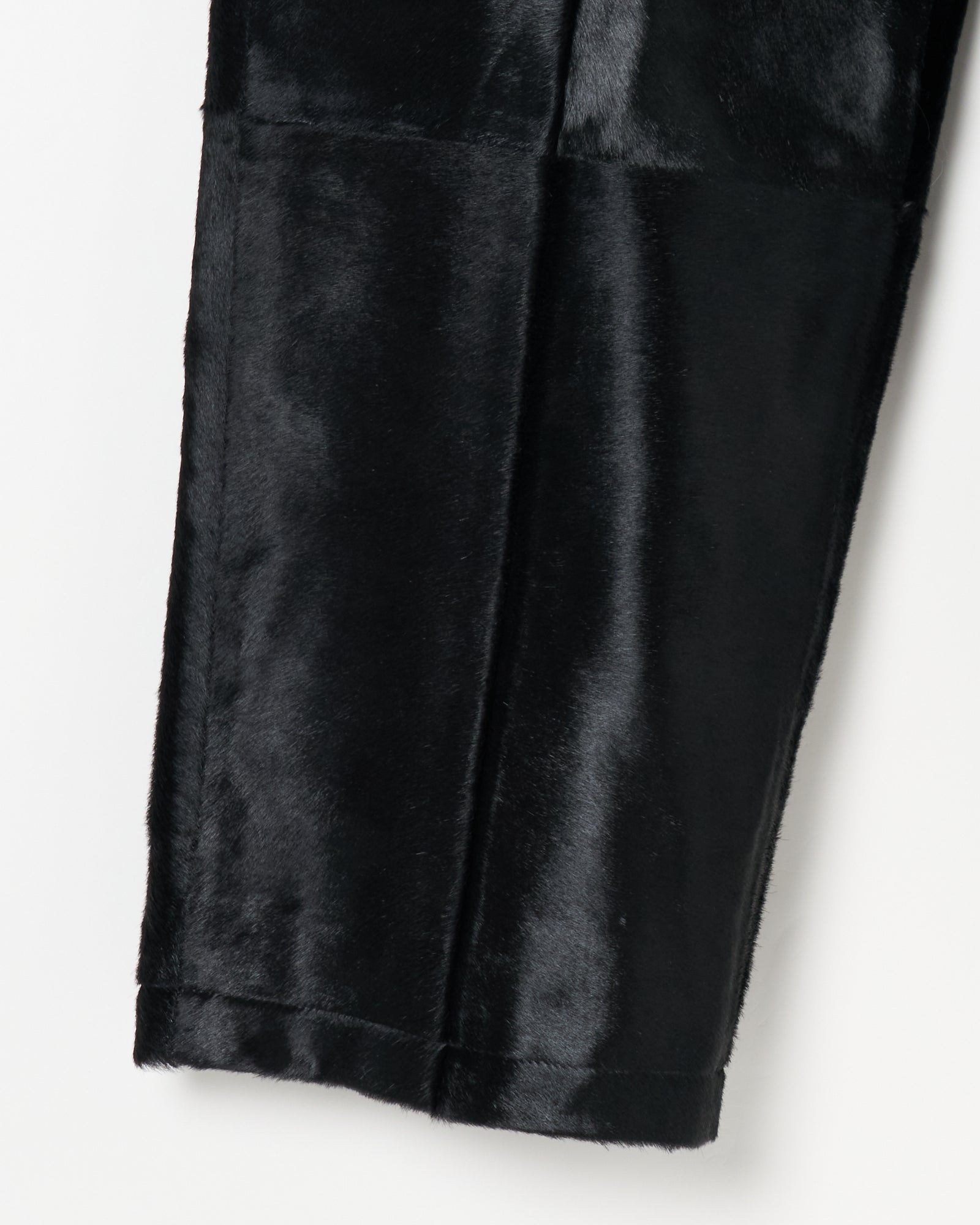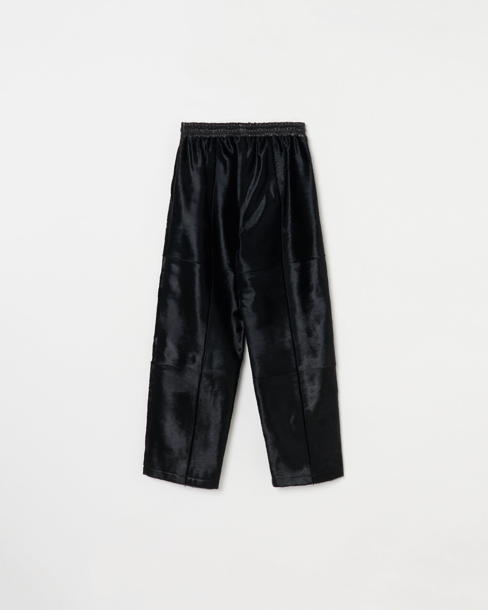 光沢感と上質な肌触りが特徴の最上級のハラコ素材を使用したレザーパンツ。トラックパンツをリファレンスにウエストはゴム仕様でリラックスした雰囲気を感じるシルエットに仕上げています。