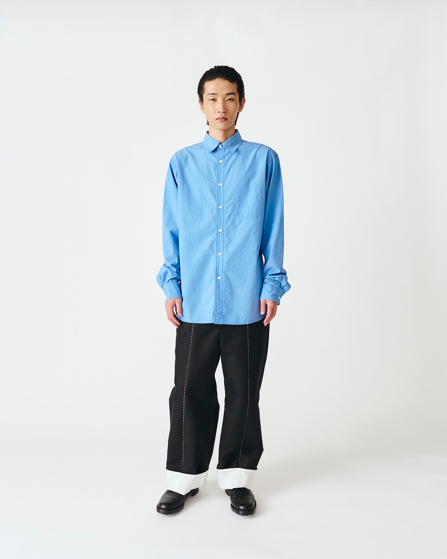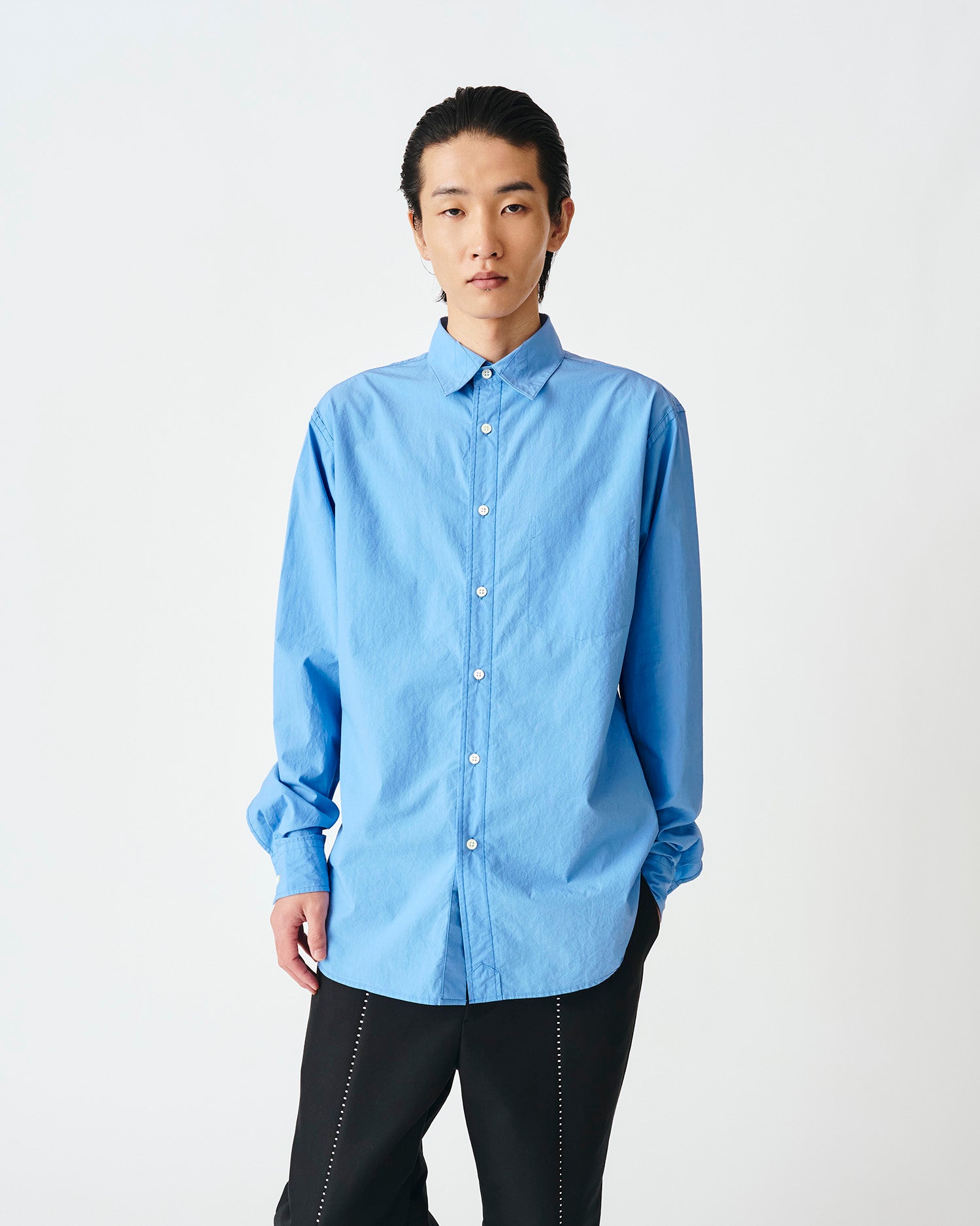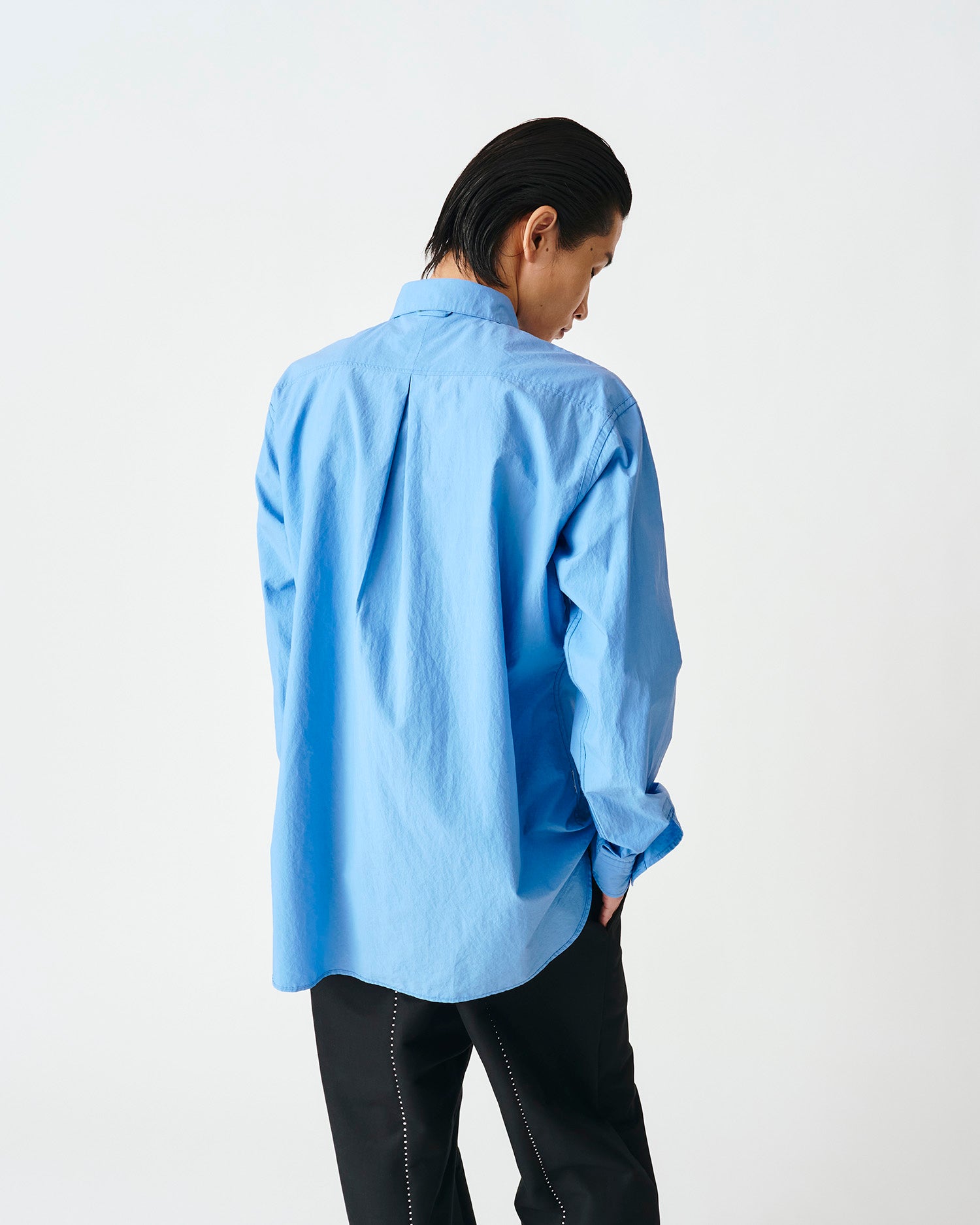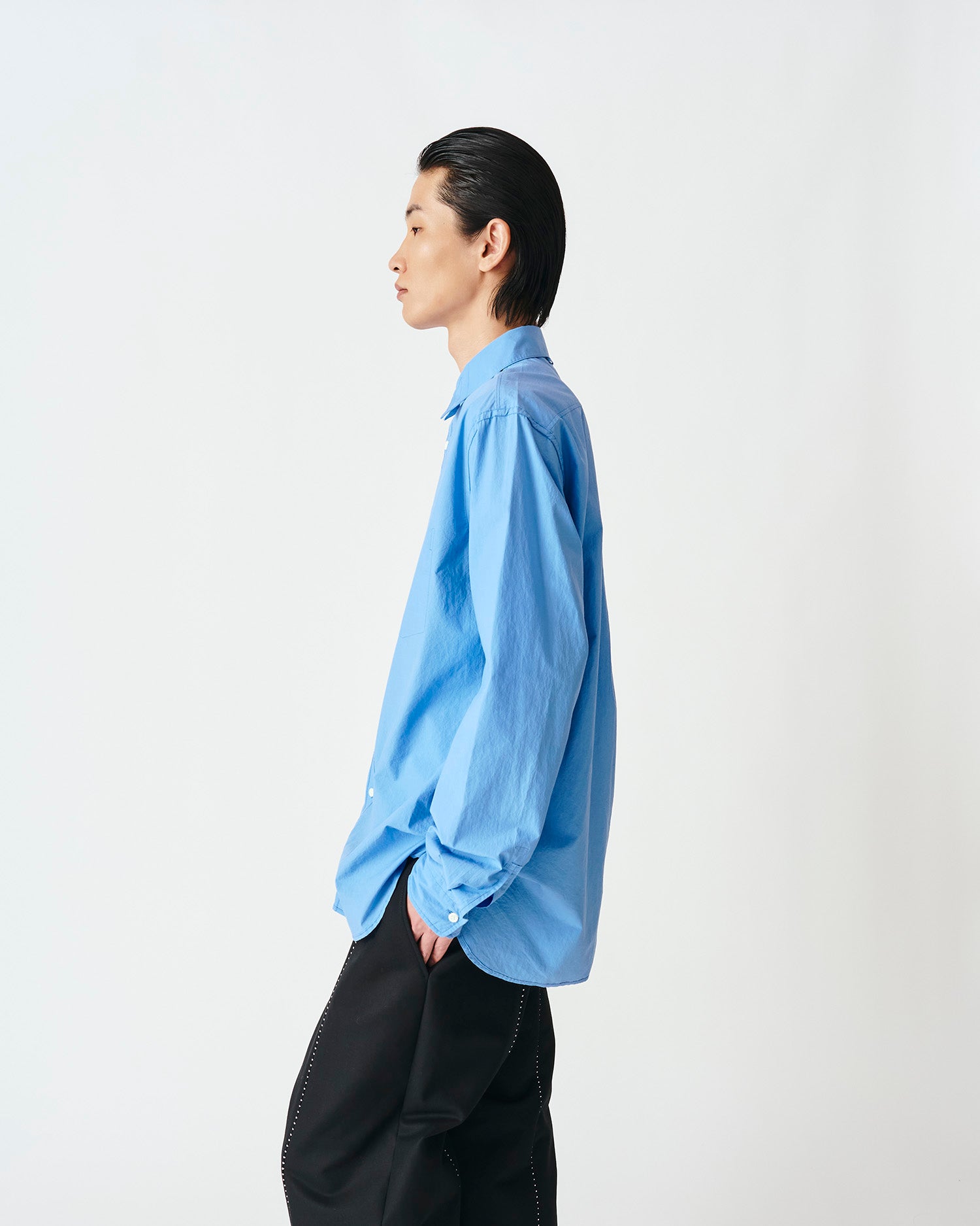 ペーパーライクな独特の張りが特徴のコットンタイプライターを使用したレギュラーカラーシャツ。表裏を裏返したデザインが特徴で配色ステッチで表情をつけています。リラックスシルエット。