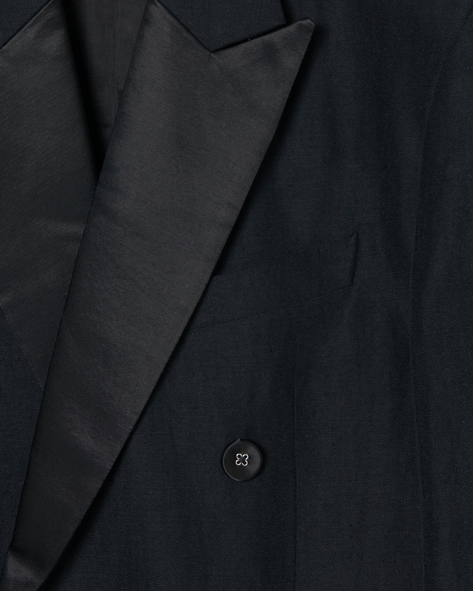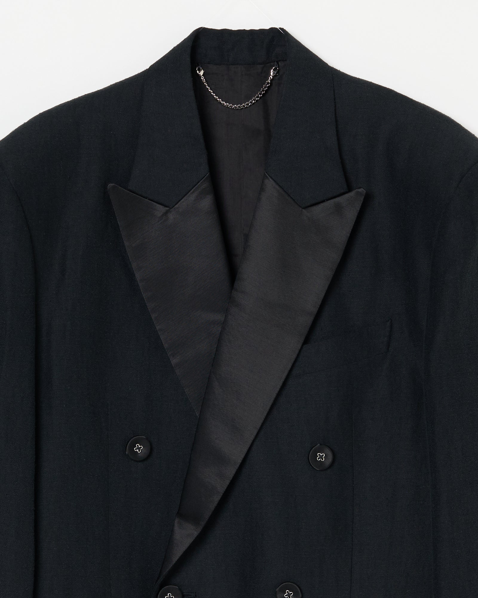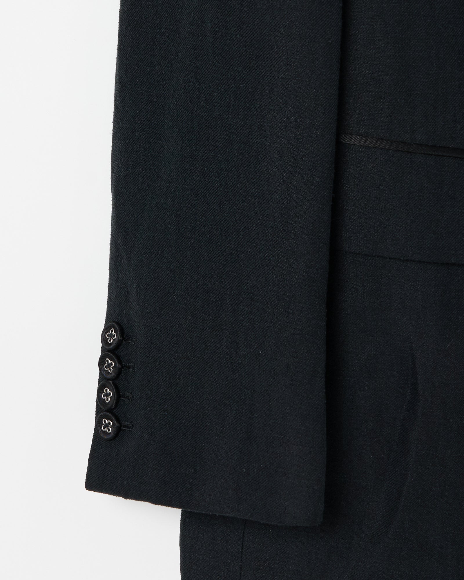 ネップ感が特徴のシルクノイルコットン素材を使用したタキシードジャケット。シルクならではの優雅なドレープ性と毛芯仕立ての構築的なシルエット、ビルドアップショルダーが特徴です。くるみボタンやポケット口にサテン生地を使用、袖口は本切羽仕様でフォーマル仕立てのジャケットになります。