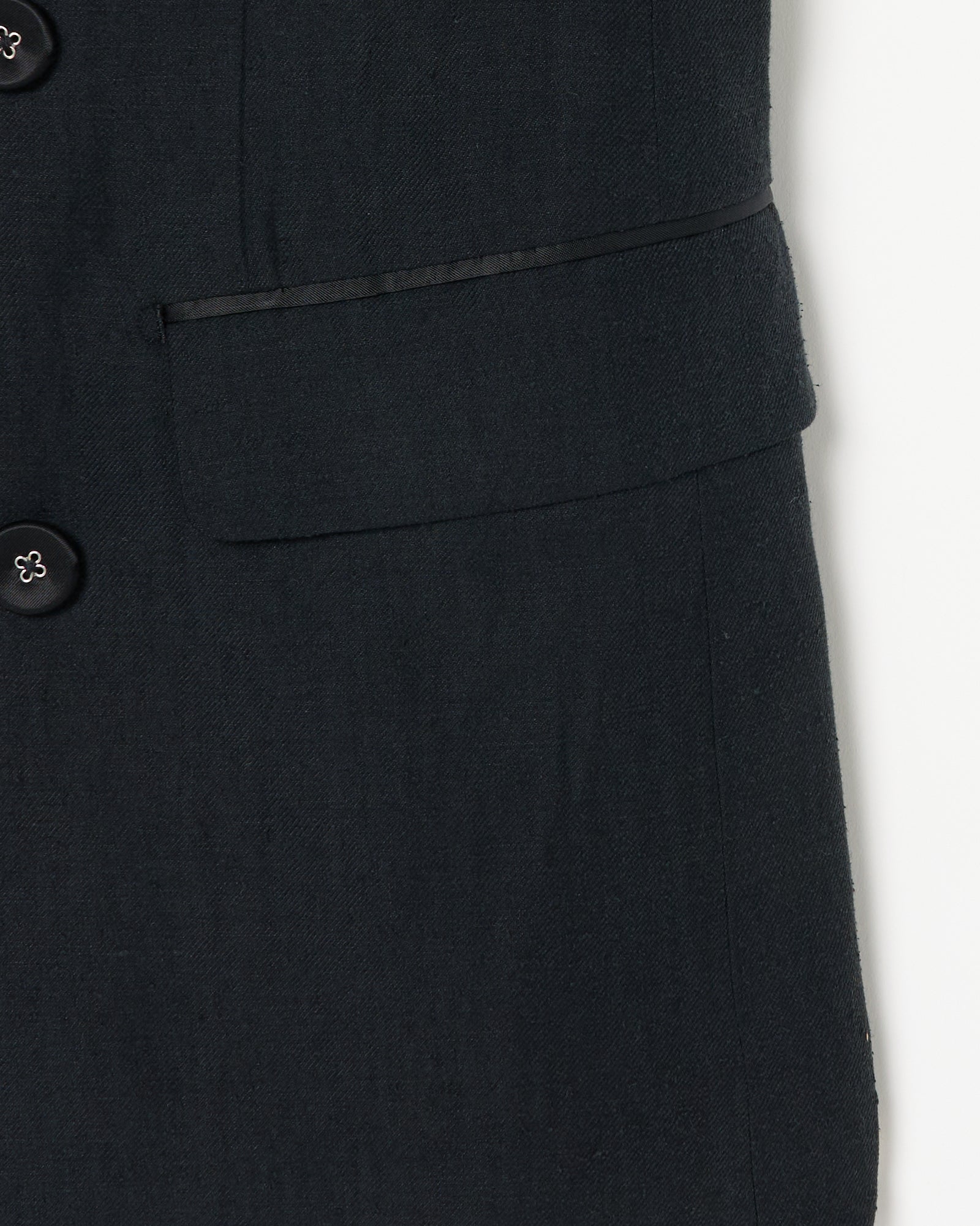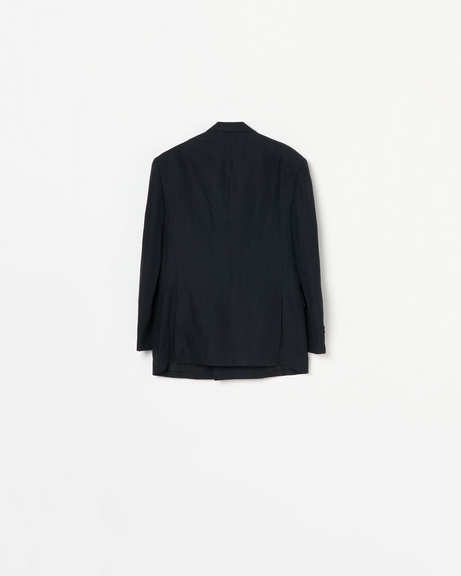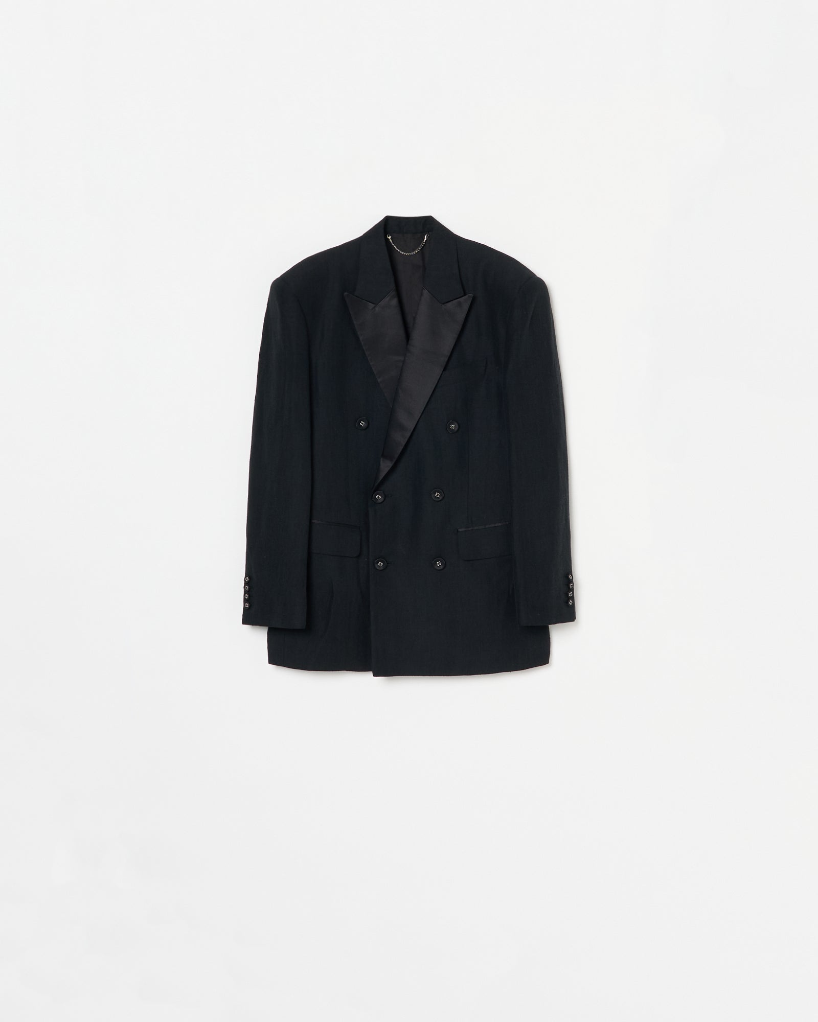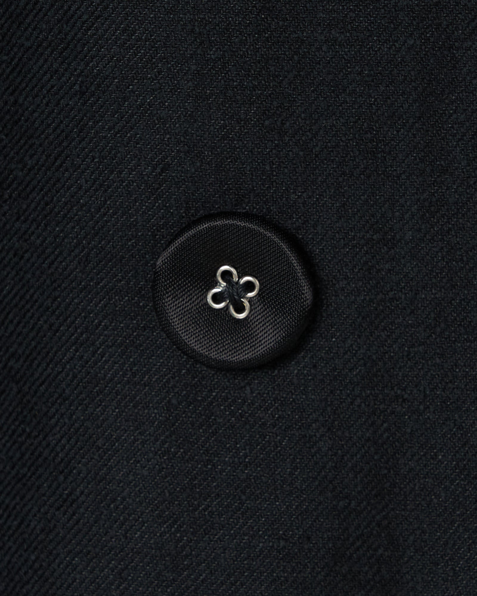 ネップ感が特徴のシルクノイルコットン素材を使用したタキシードジャケット。シルクならではの優雅なドレープ性と毛芯仕立ての構築的なシルエット、ビルドアップショルダーが特徴です。くるみボタンやポケット口にサテン生地を使用、袖口は本切羽仕様でフォーマル仕立てのジャケットになります。