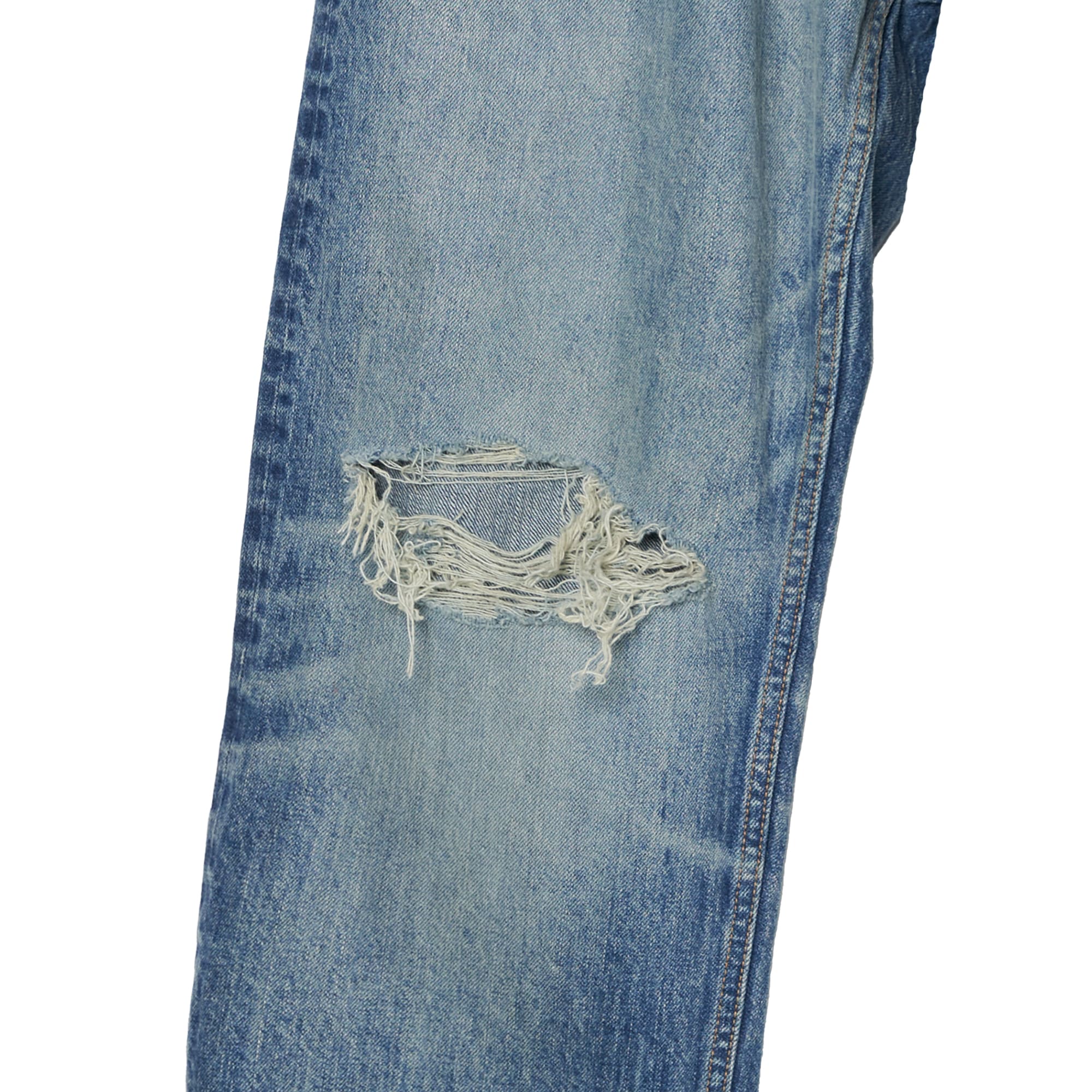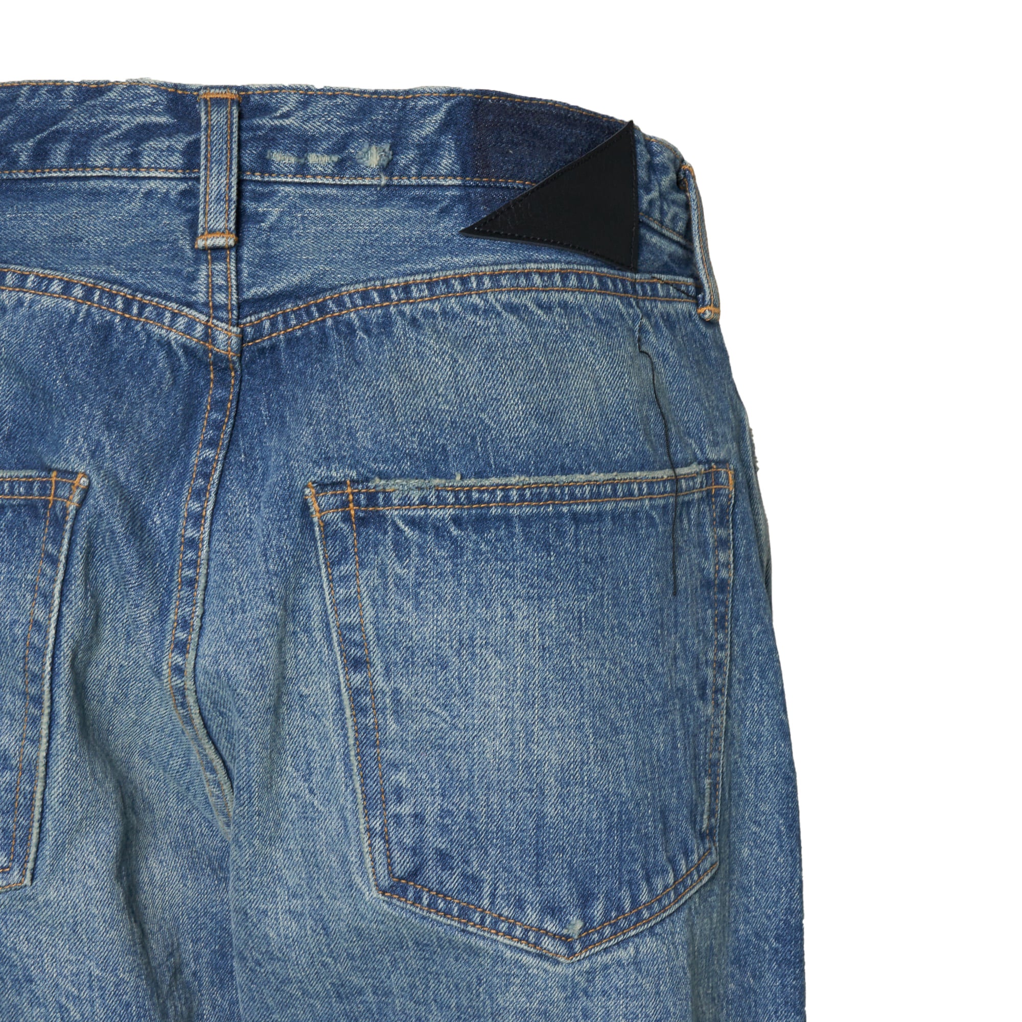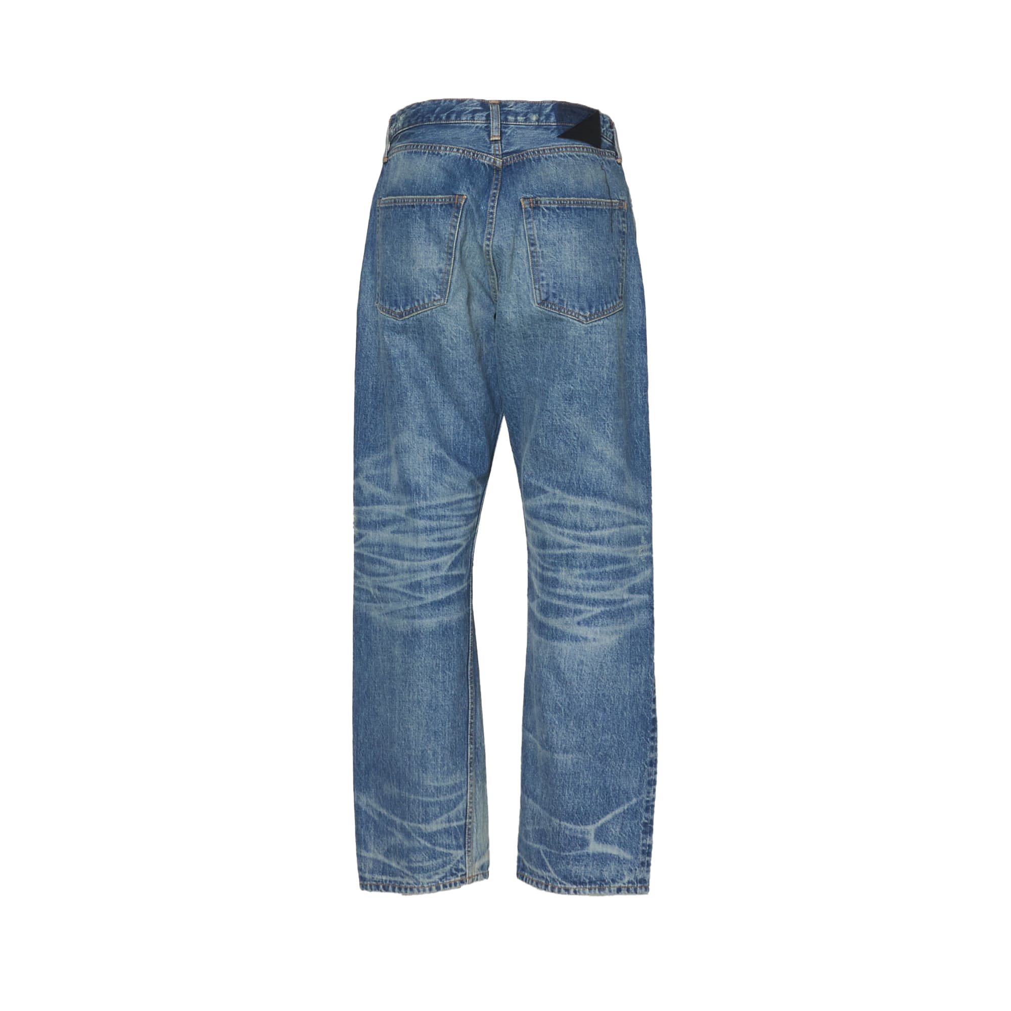 生地が描く、空気を孕んだような繊細な凹凸。職人による計算された色落ちとベージュトッピングは、デニムに深い陰影を与えます。旧式力織機で丁寧に紡がれたセルビッチ生地が体現する、本質を追求した至高の一本。