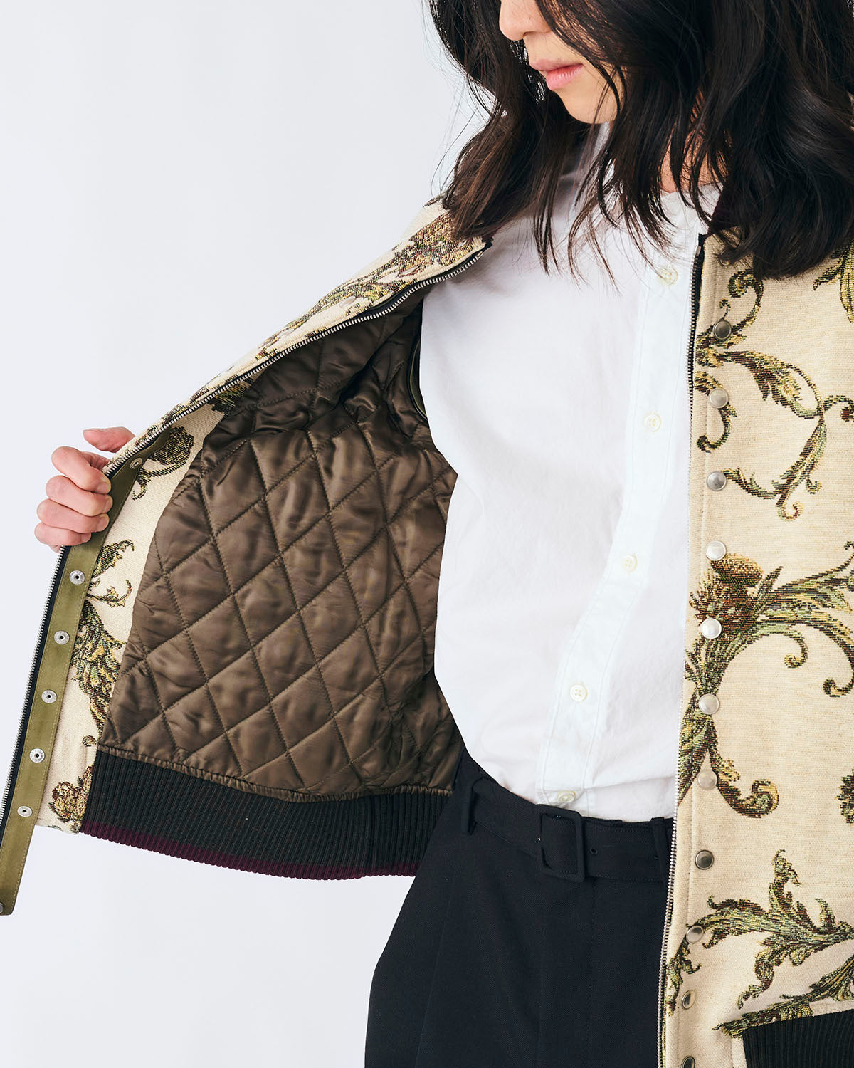 膨らみ感のあるモール糸をベースに設計されたゴブラン織りジャガードを使用したバーシティジャケット。クラシックな絨毯をリファレンスに袖はレザー切り替えで、デタッチャブル仕様が特徴です。フロントもデタッチャブル仕様のファスナー使いで取り外しが可能です。