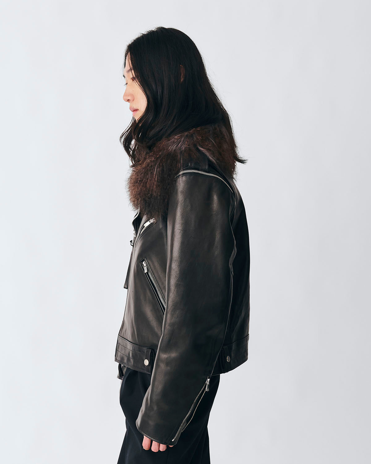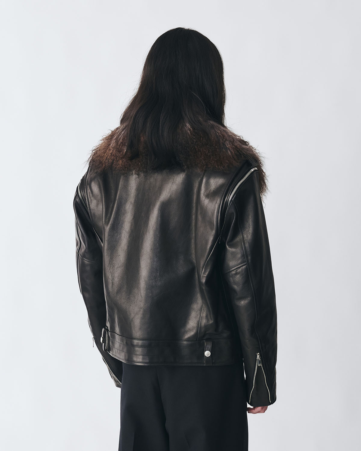 植物由来のタンニンなめしのホースレザーを使用したダ光沢感が特徴のダブルライダースジャケット。アームホールのファスナー使いによりノースリーブでも着用可能なデタッチャブル仕様です。襟には取り外し可能なチベットラムファーを使用し、着用するごとに体に馴染む経年変化が特徴の1着です。