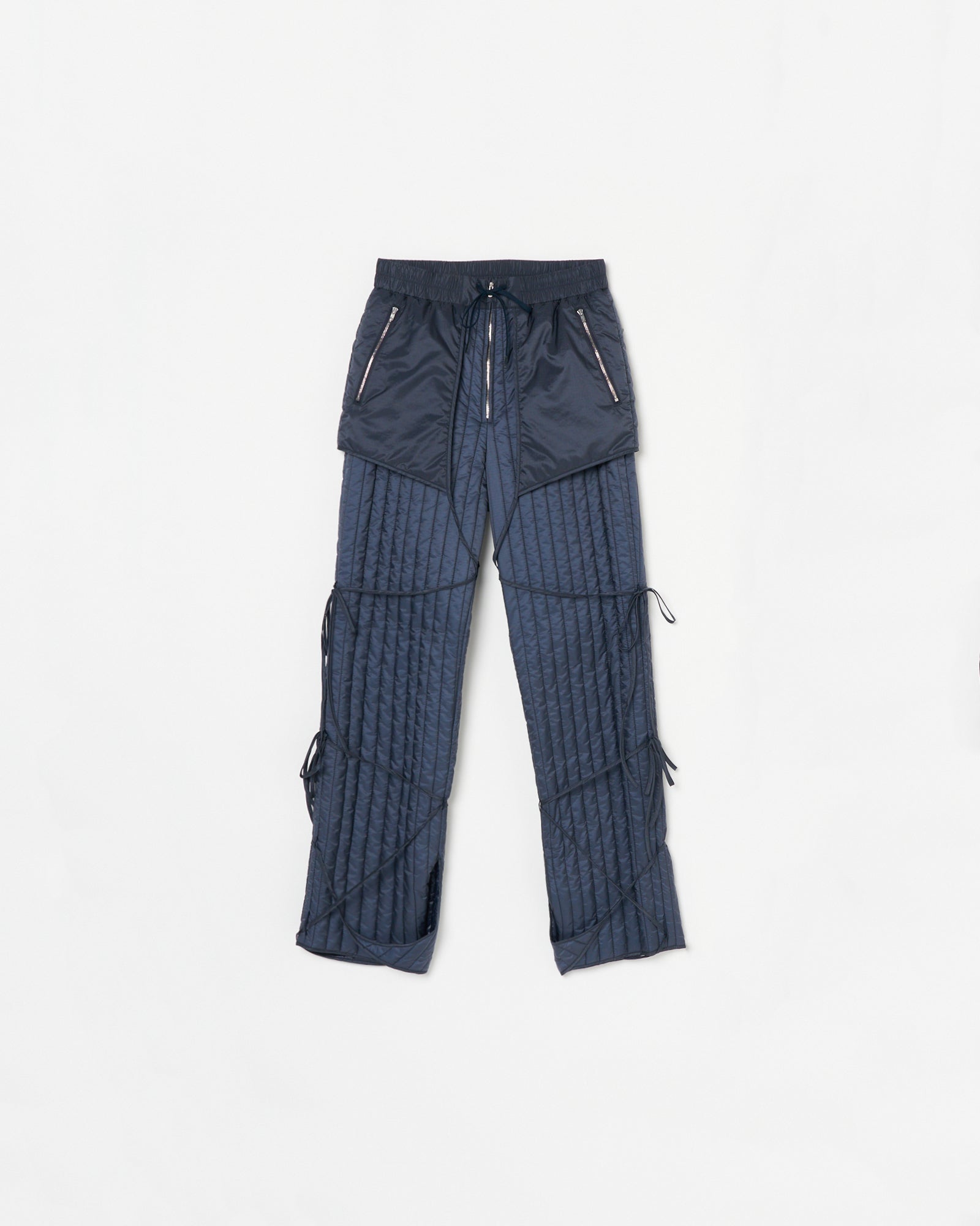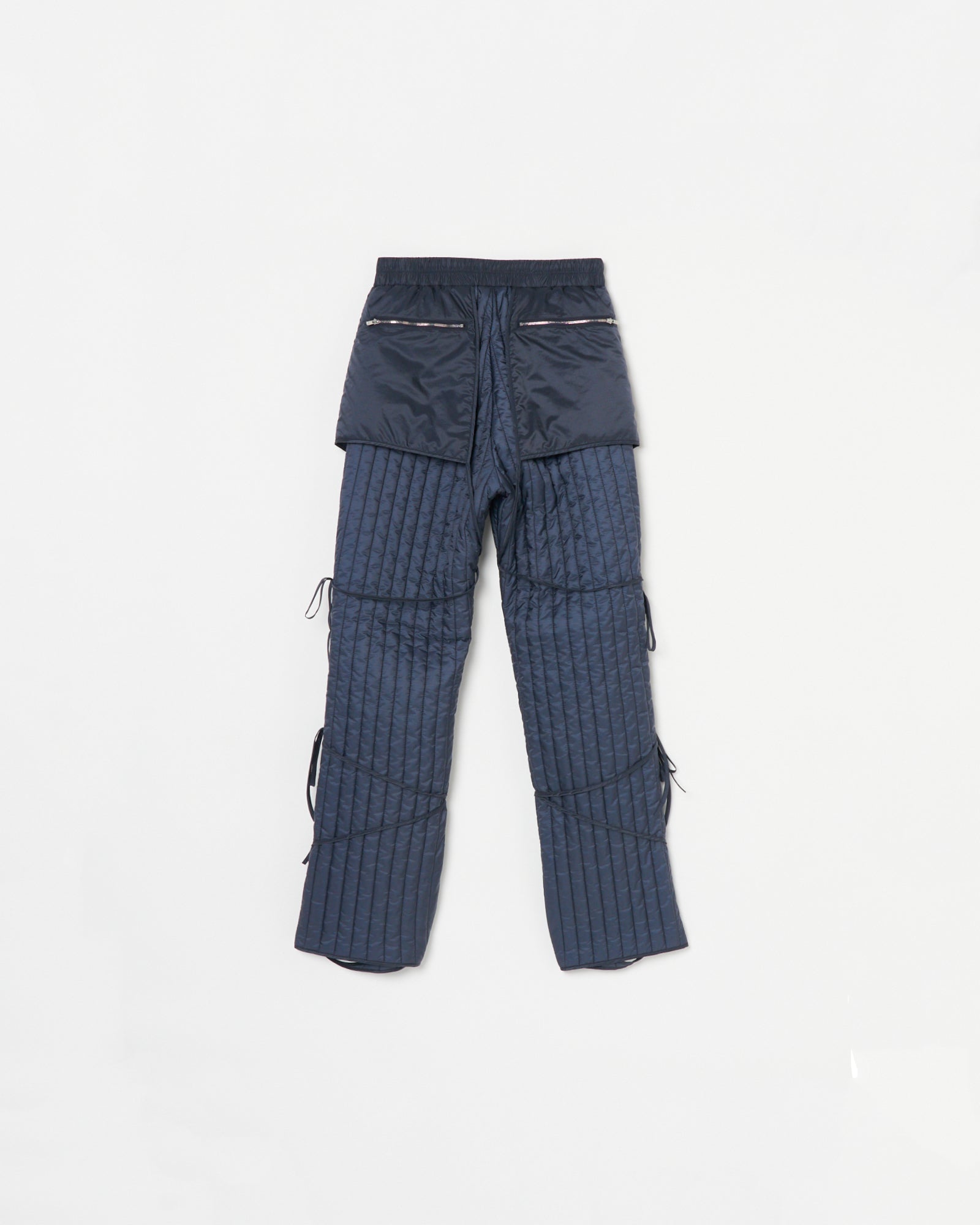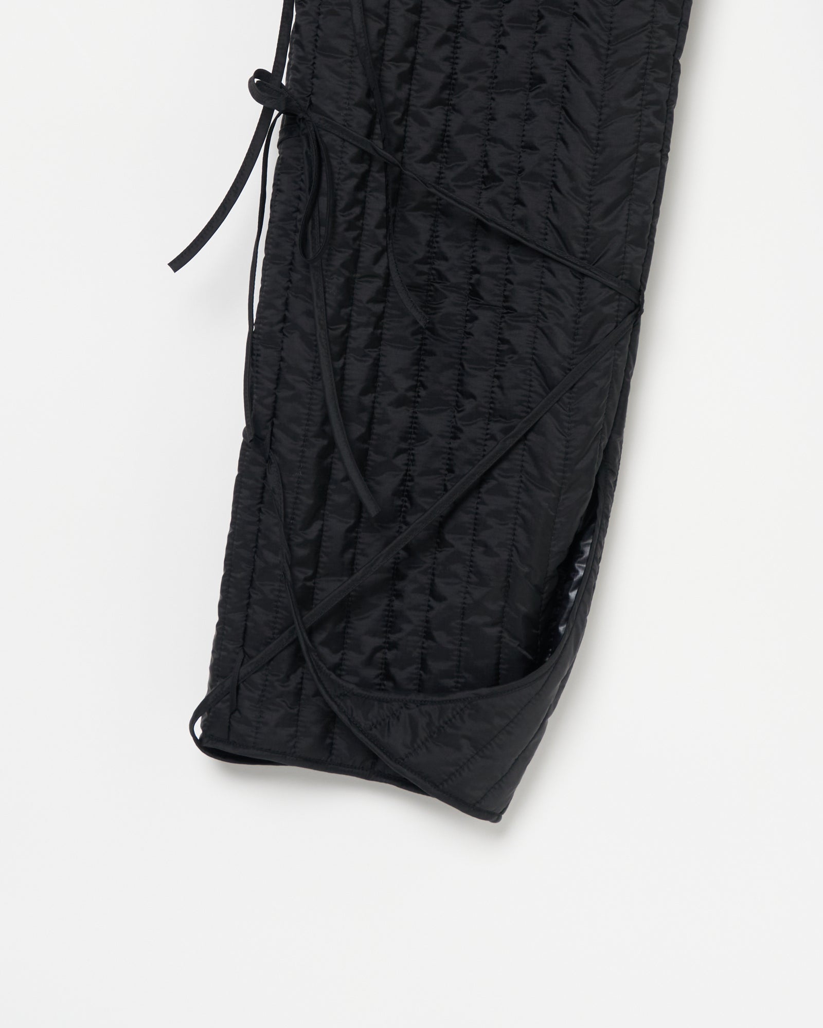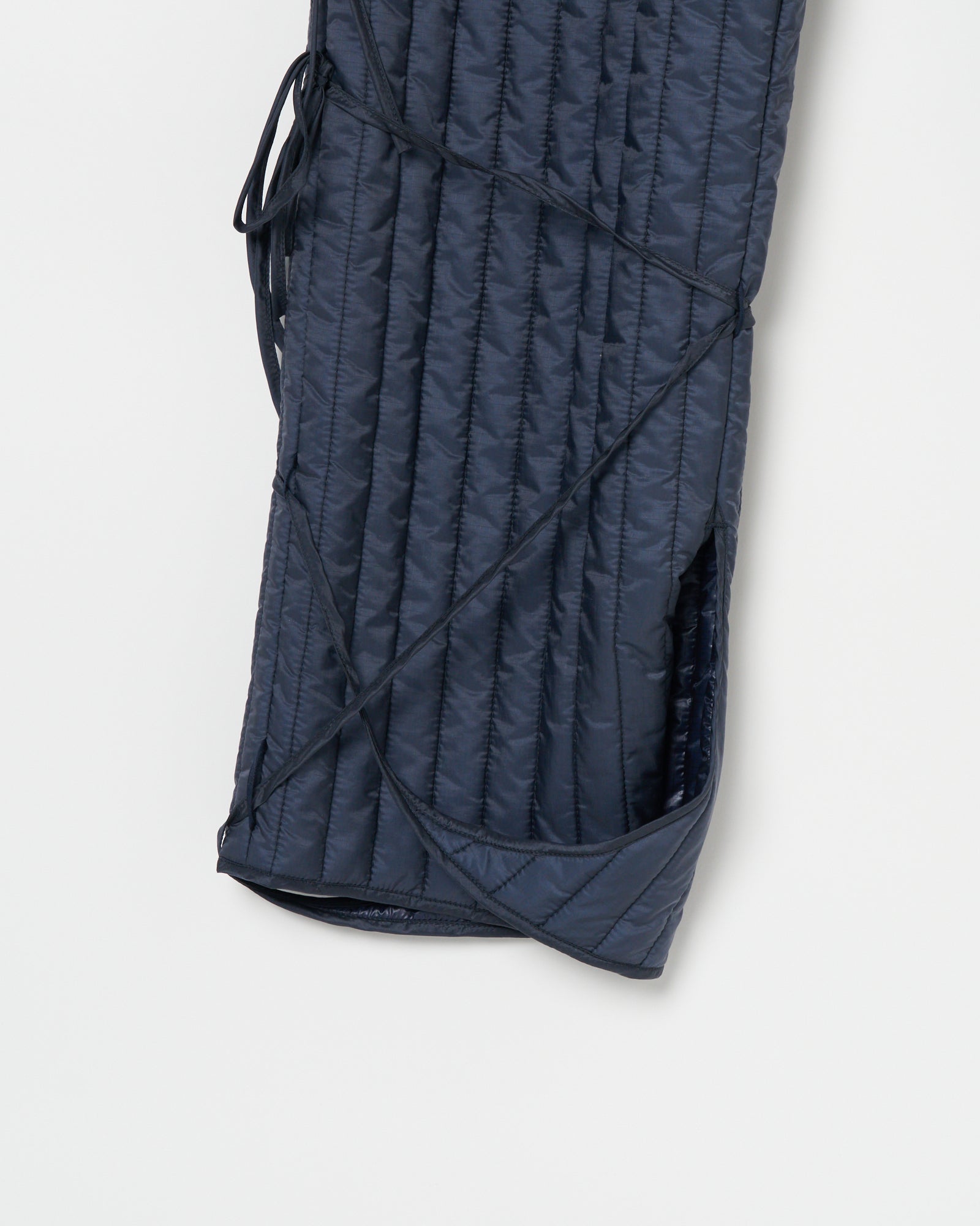 ナイロンリップストップ素材にキルティング加工を施したキルティングパンツ。中綿による立体的なボリューム感が特徴で、裾部分は足のふくらはぎに巻き付くように縛り上げるデザインが特徴です。
