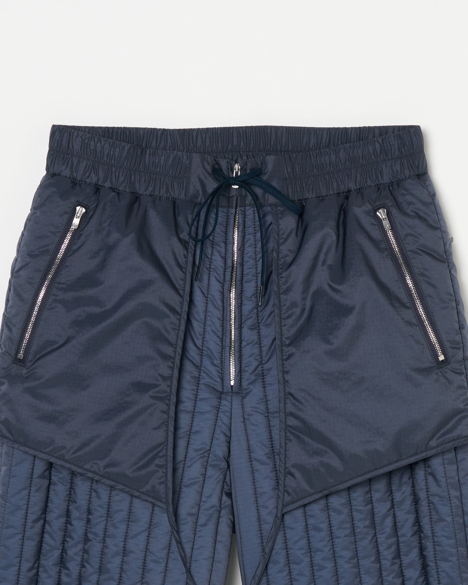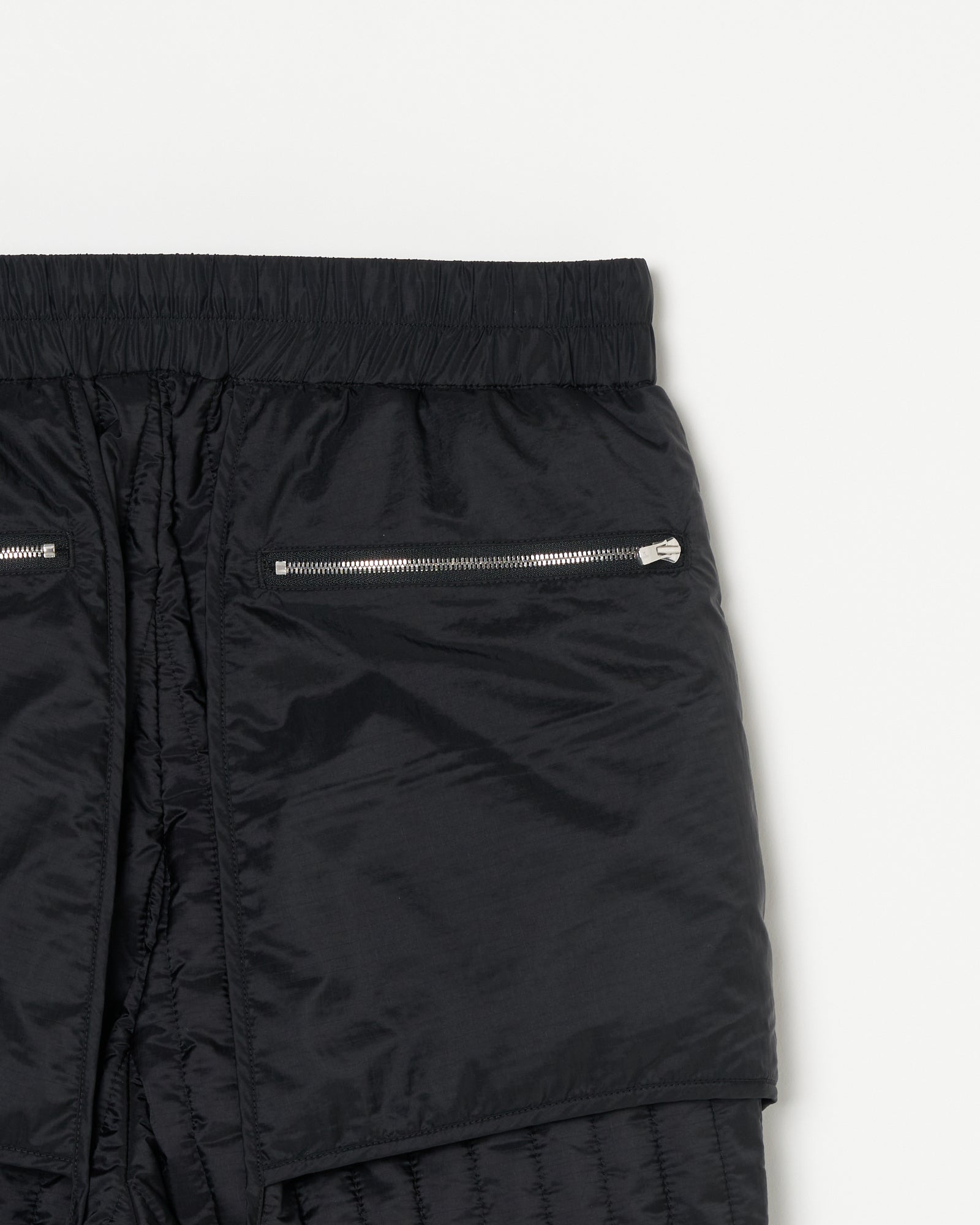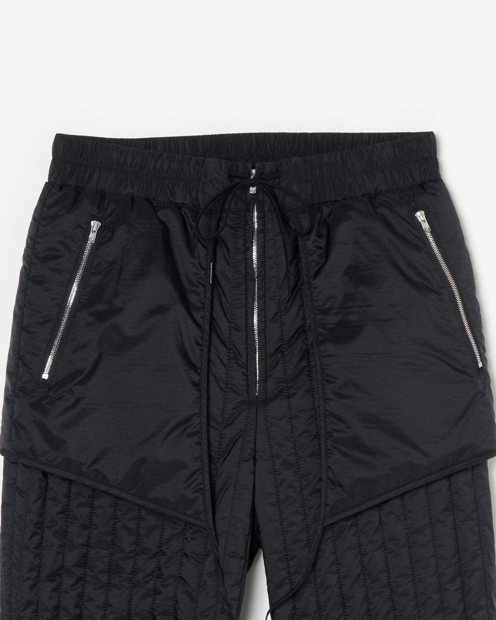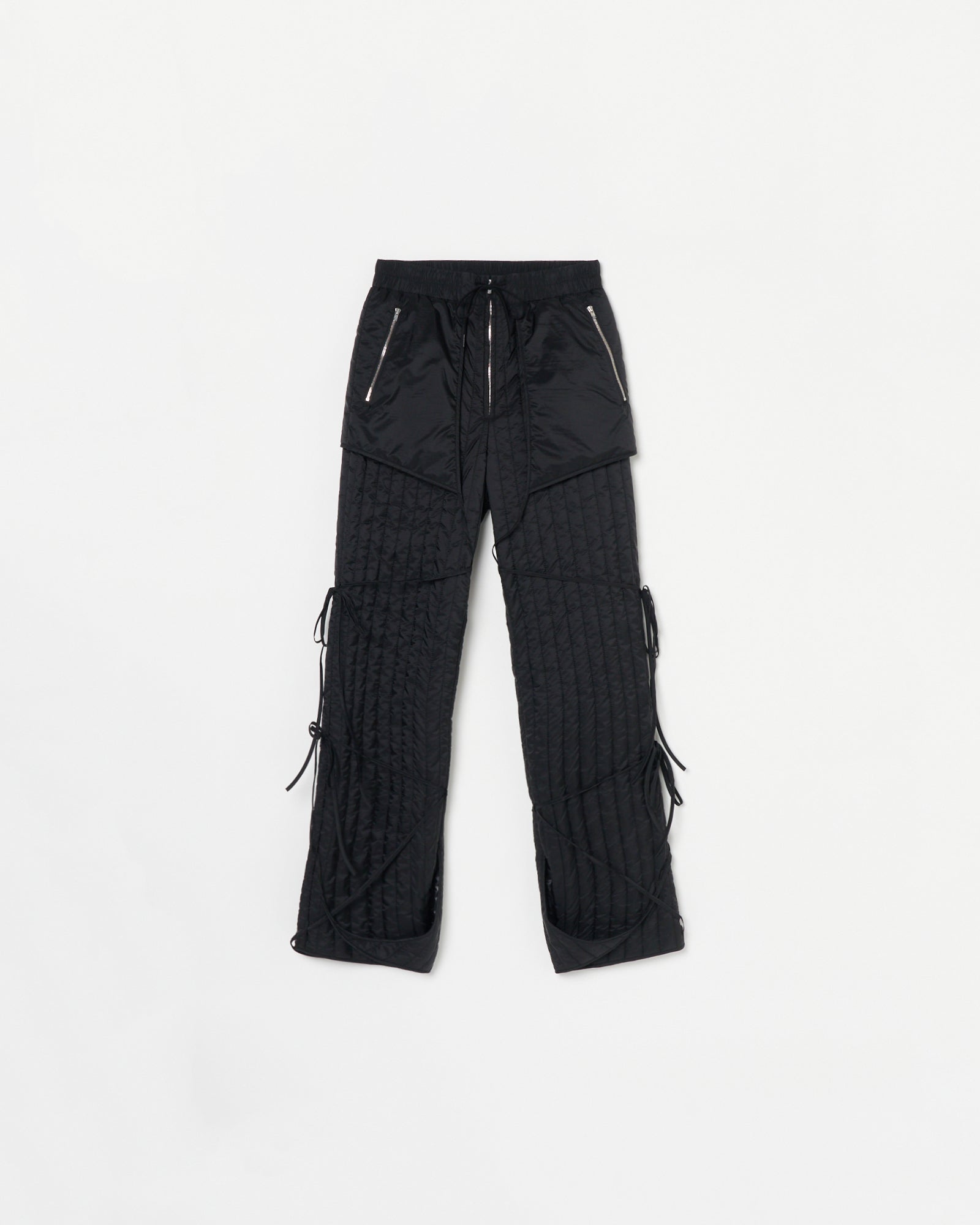 ナイロンリップストップ素材にキルティング加工を施したキルティングパンツ。中綿による立体的なボリューム感が特徴で、裾部分は足のふくらはぎに巻き付くように縛り上げるデザインが特徴です。