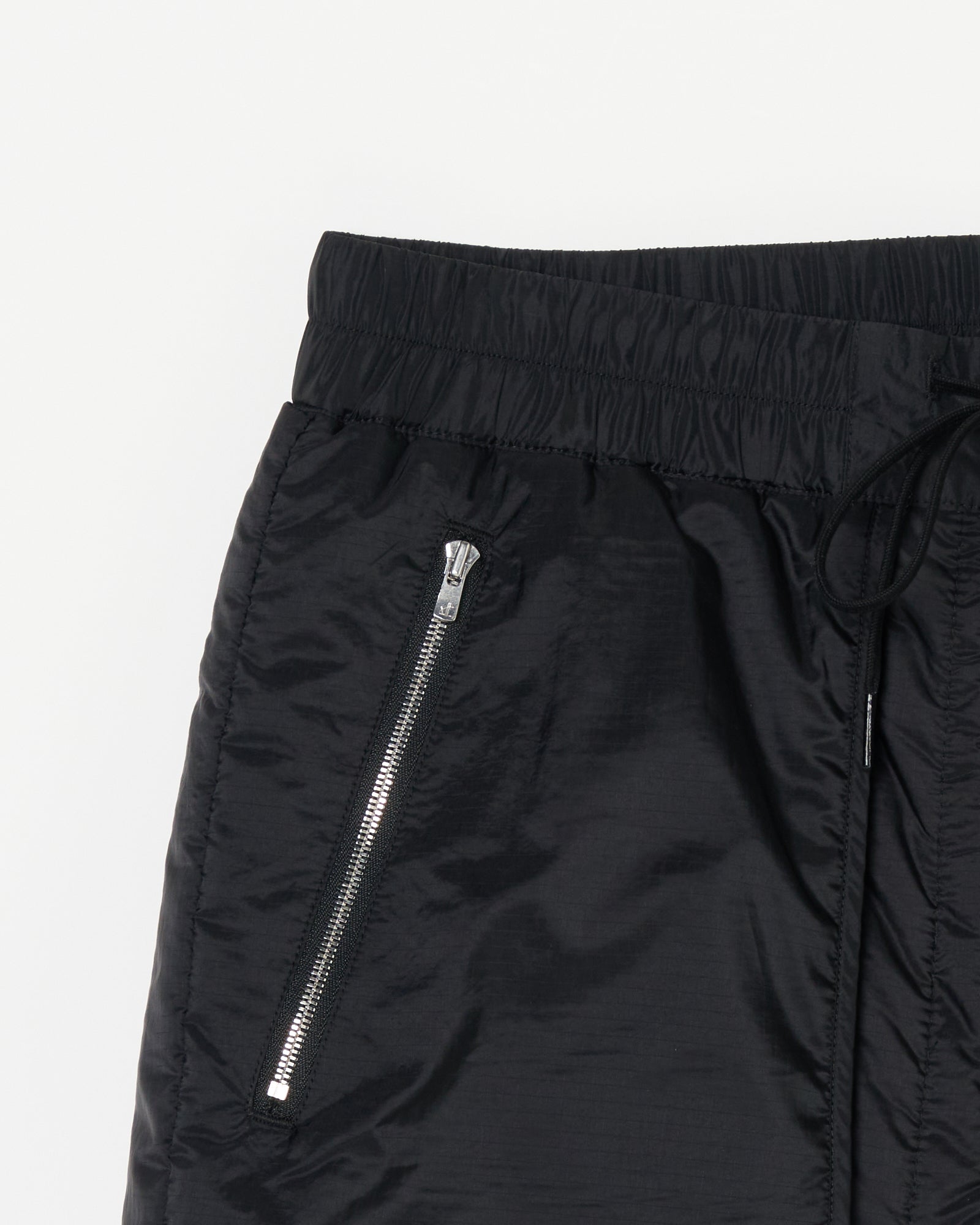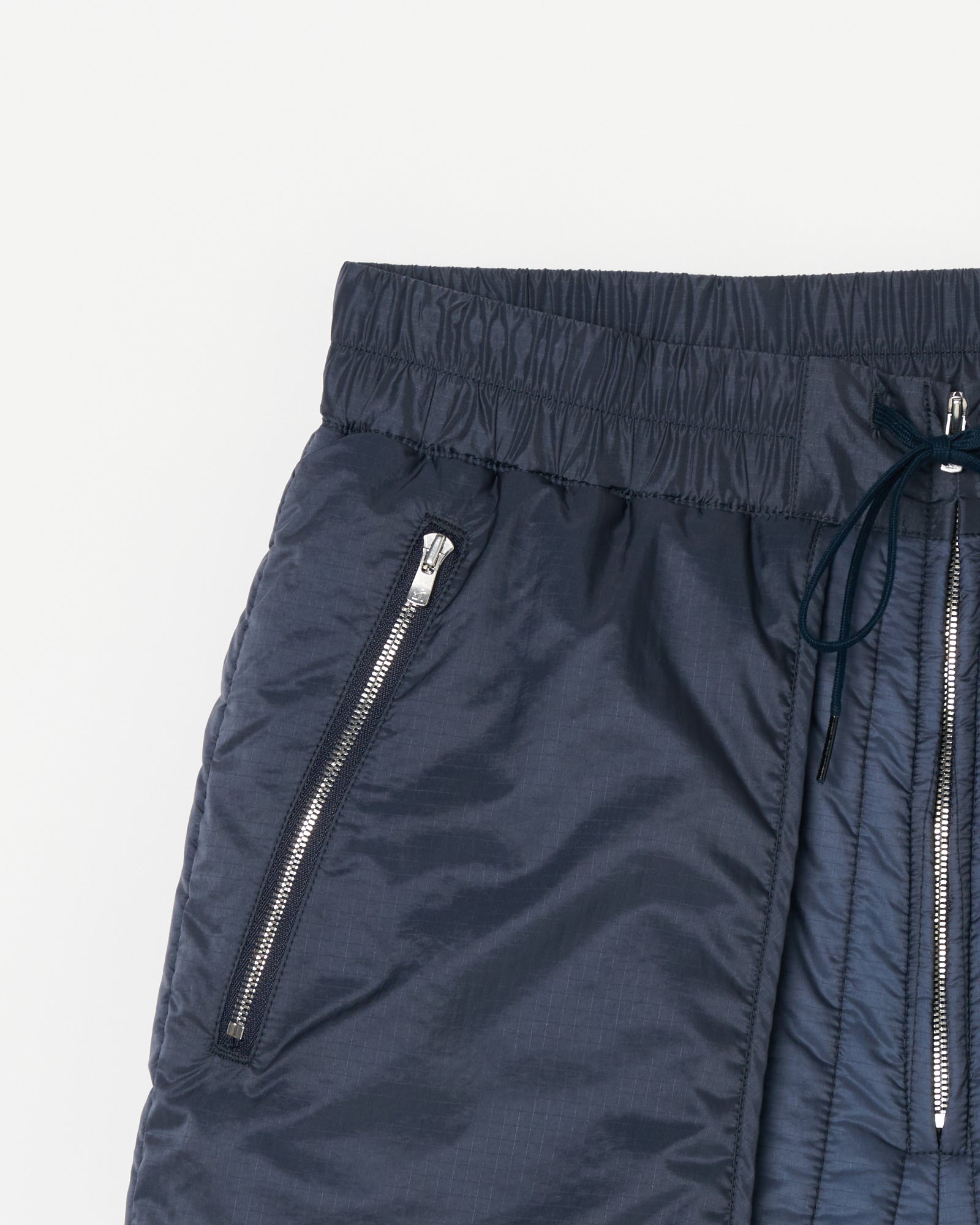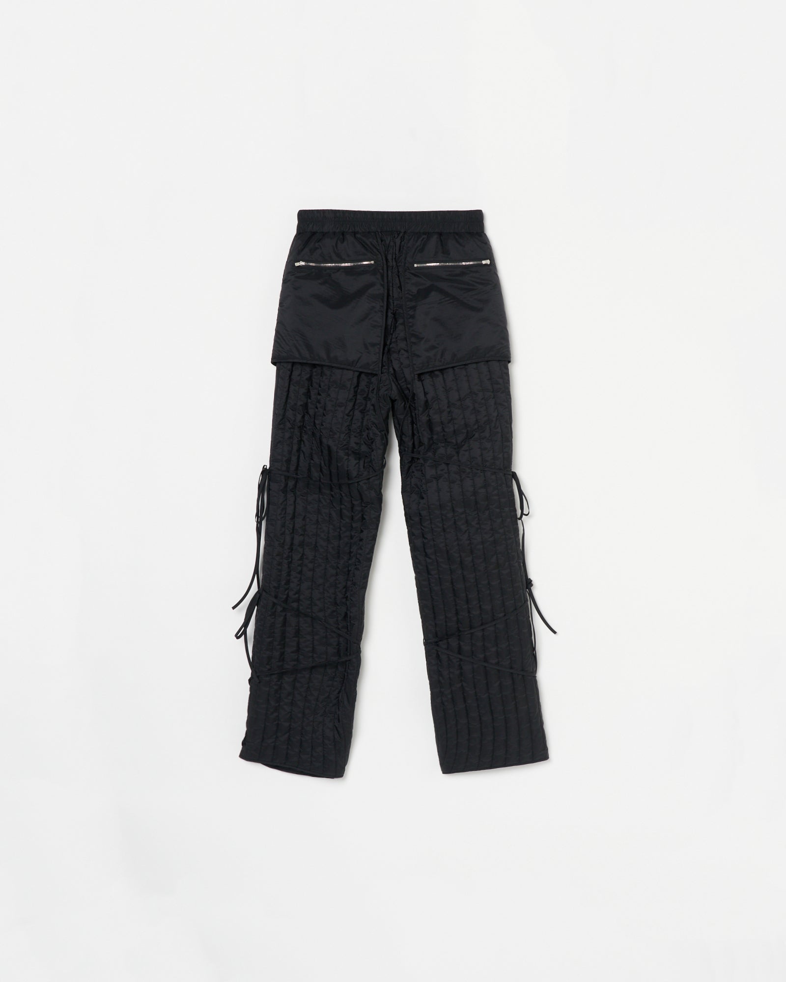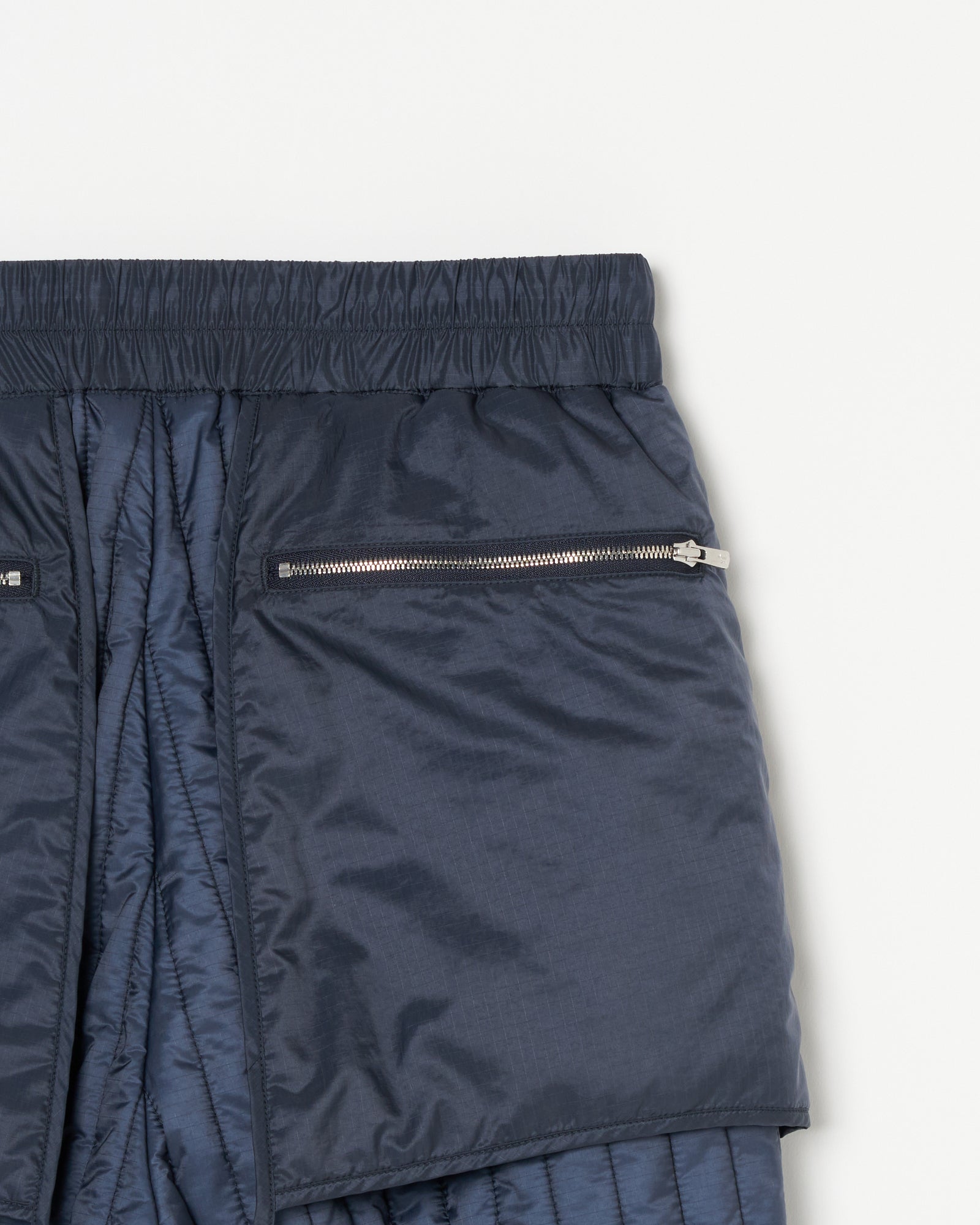 ナイロンリップストップ素材にキルティング加工を施したキルティングパンツ。中綿による立体的なボリューム感が特徴で、裾部分は足のふくらはぎに巻き付くように縛り上げるデザインが特徴です。