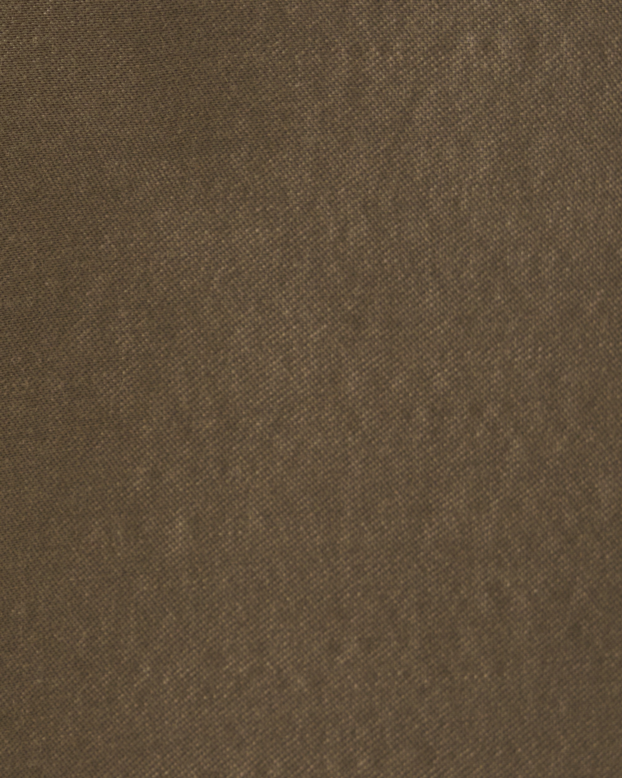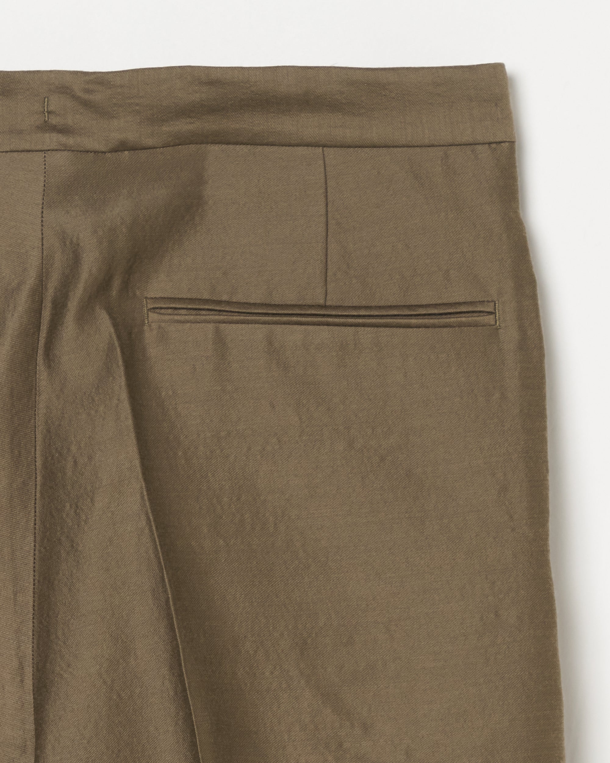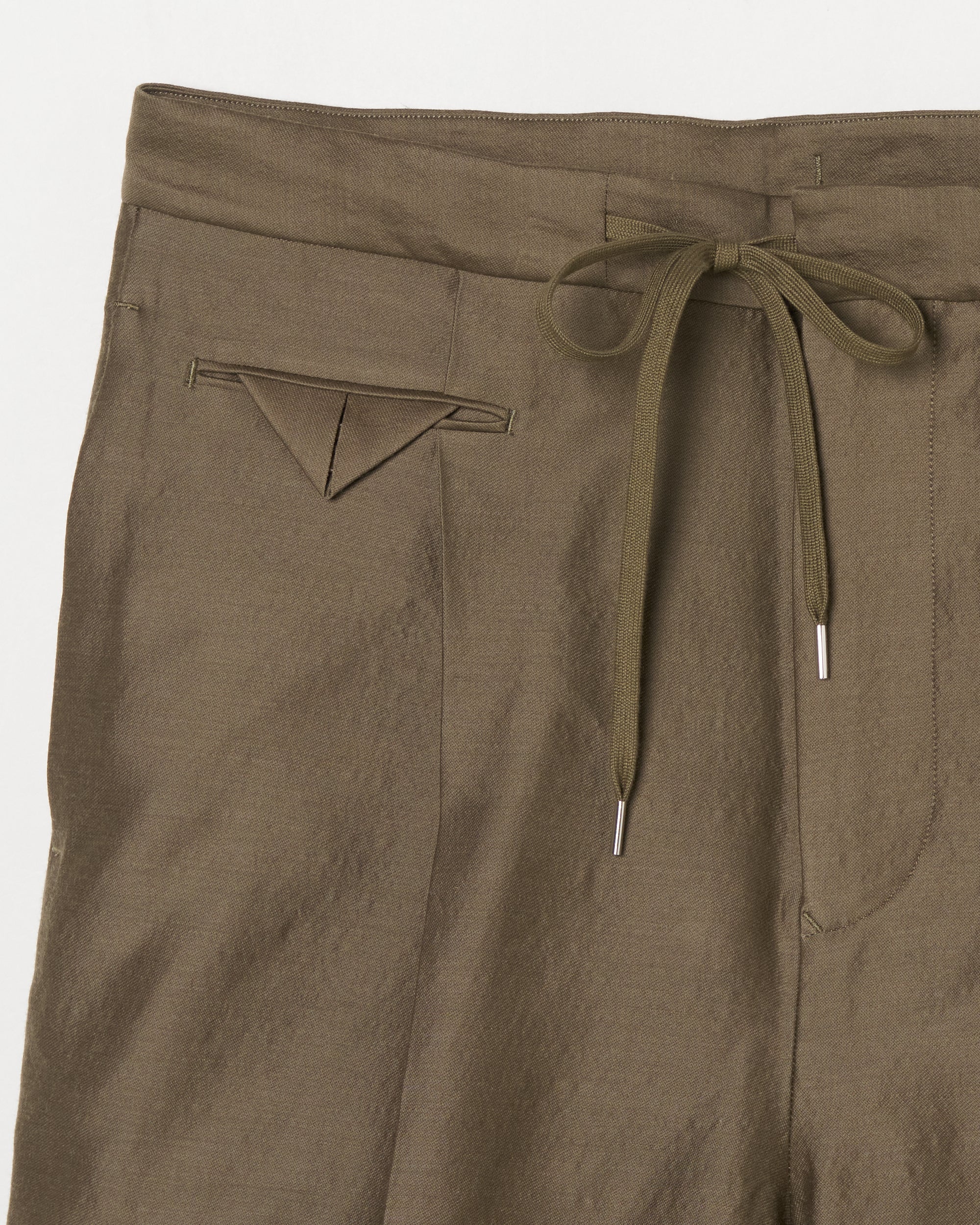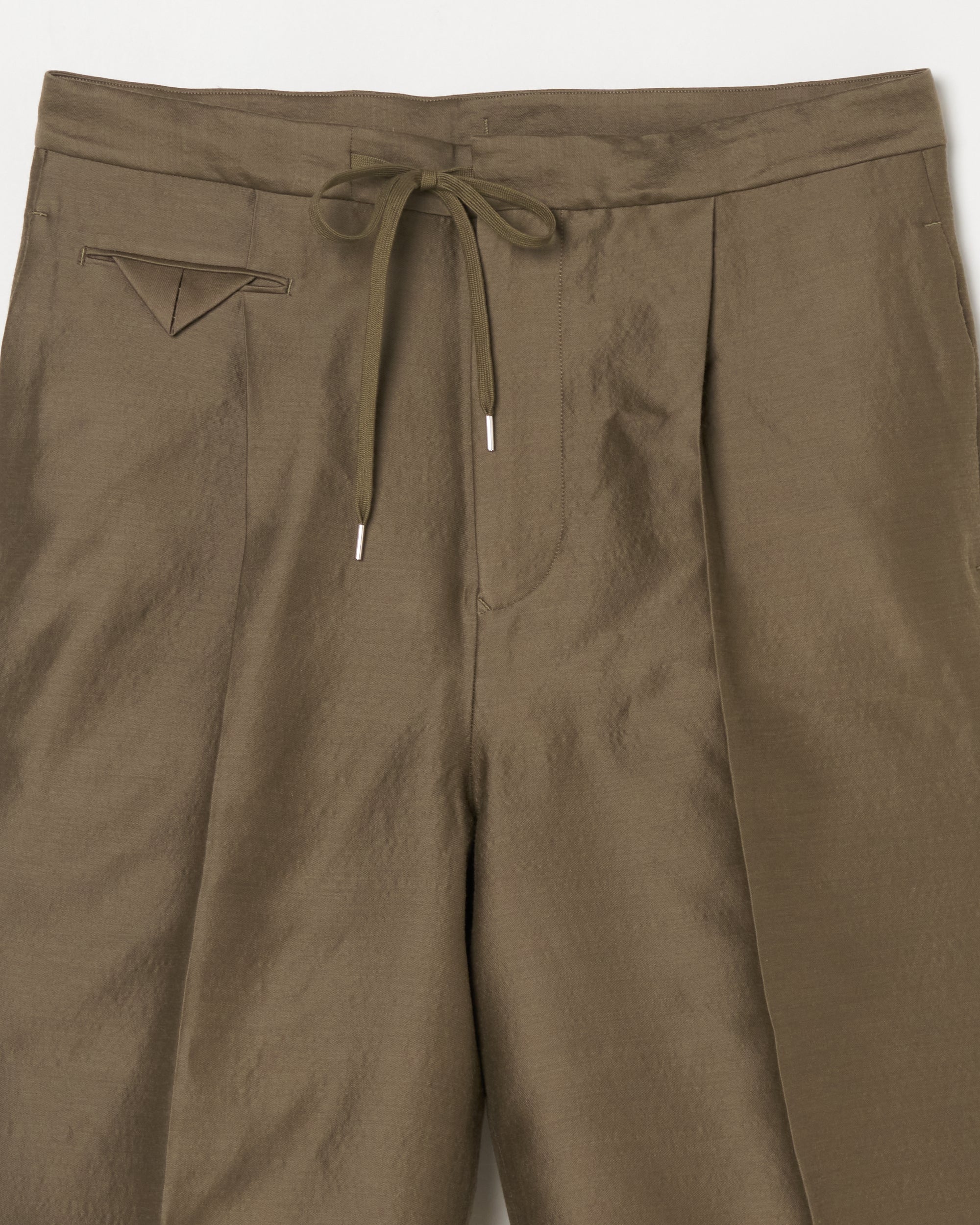 リラックスしたシルエットと清涼感を感じるタッチと肌触り、軽量性が特徴の素材で凹凸のある表面感と粗野な表情ながらシルクの光沢やウールらしいドライなタッチが特徴です。ウエストはスピンドル仕様。