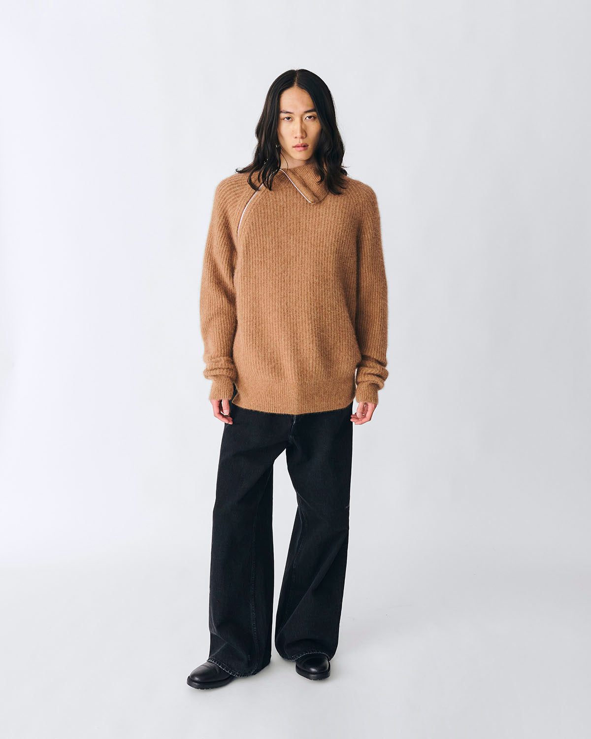 上質なコットン素材に独自の加工技法を重ねた、ワイドシルエットのデニムパンツ。ゆったりとしたプロポーションが描く優雅なドレープと、職人による丁寧な加工が生み出す風合いの変化が融合。現代的なリラックススタイルに深みを与える、洗練された一本。