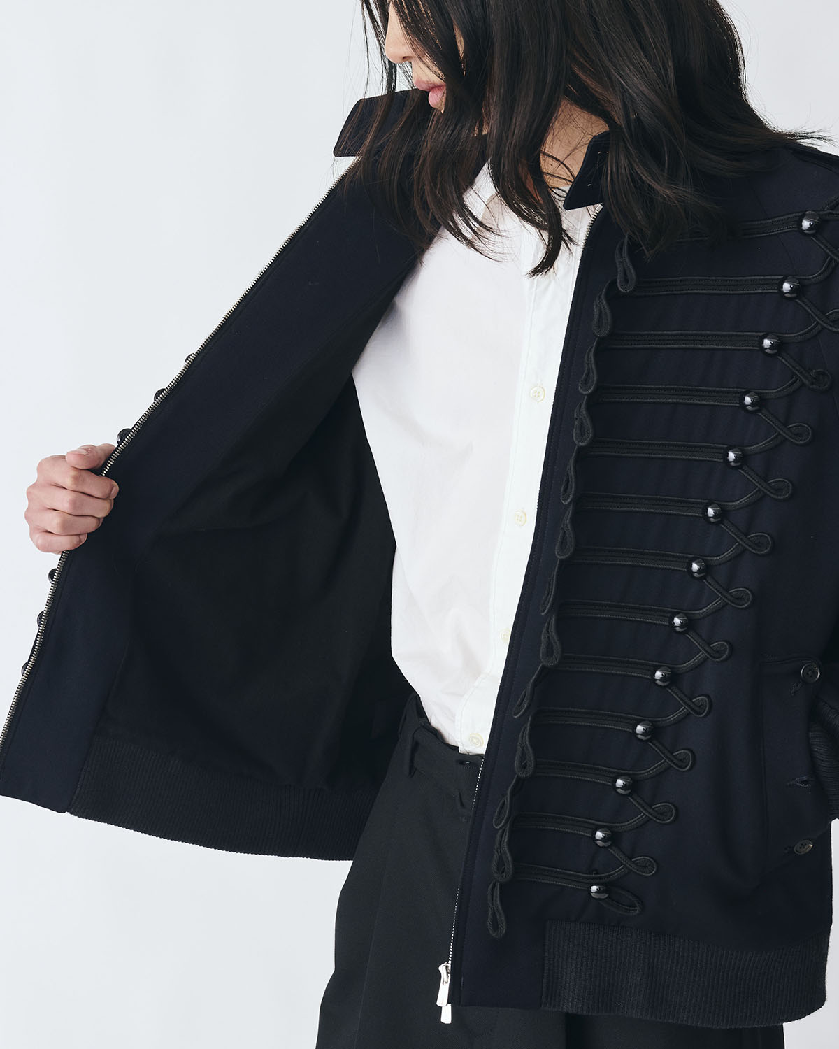 クラッシックスタイルのブルゾンとナポレオンジャケットを融合させたウールサテンブルゾンです。上質なウール素材を贅沢に使用し、上品な光沢感が特徴のサテン地で仕上げています。ナポレオンジャケットの装飾を職人による立体的なハンド刺繍で表現し、多数のボタン使いが本格的な装いを演出しています。