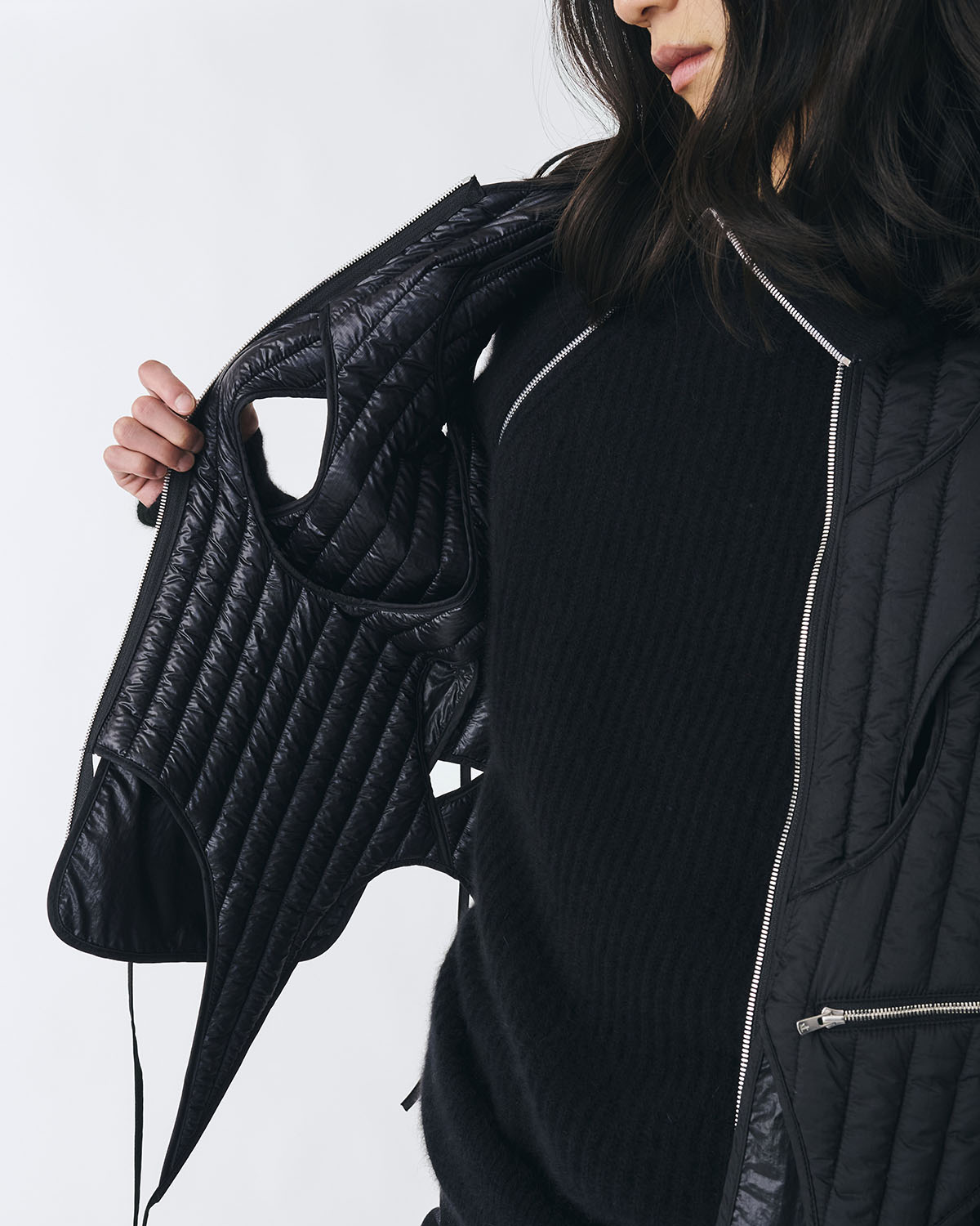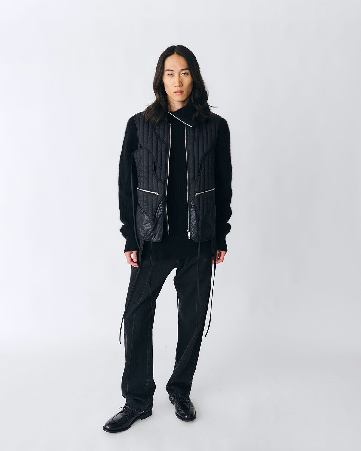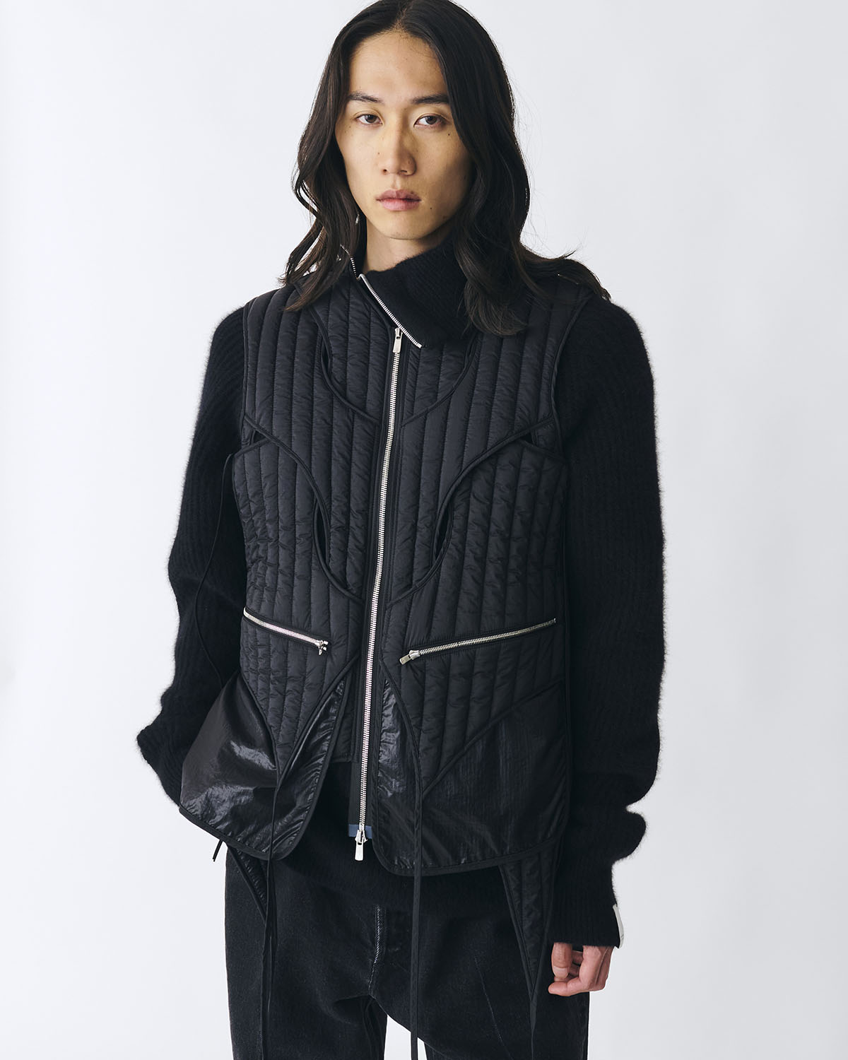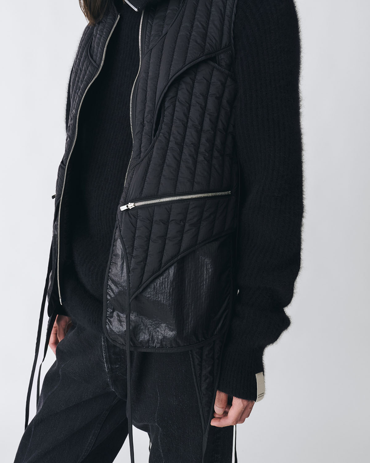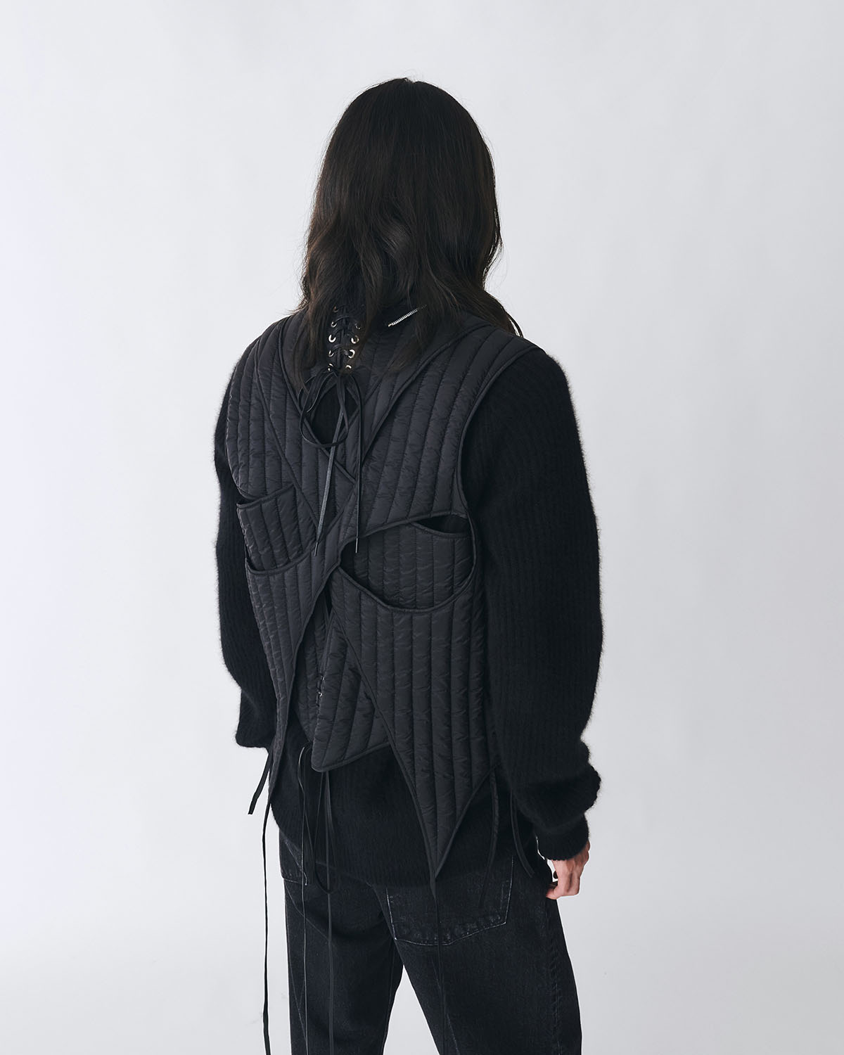 編み込むように設計されたキルティングベスト。ストライプ状のキルティングで立体的な表情とレースアップディティール、垂れ下がるパイピング使いがポイントです。AW25シーズンを象徴するアイテムです。