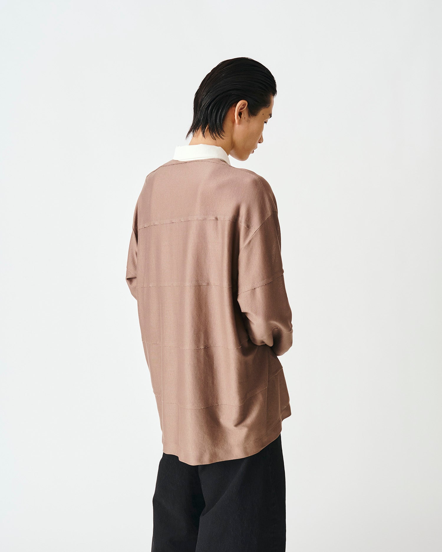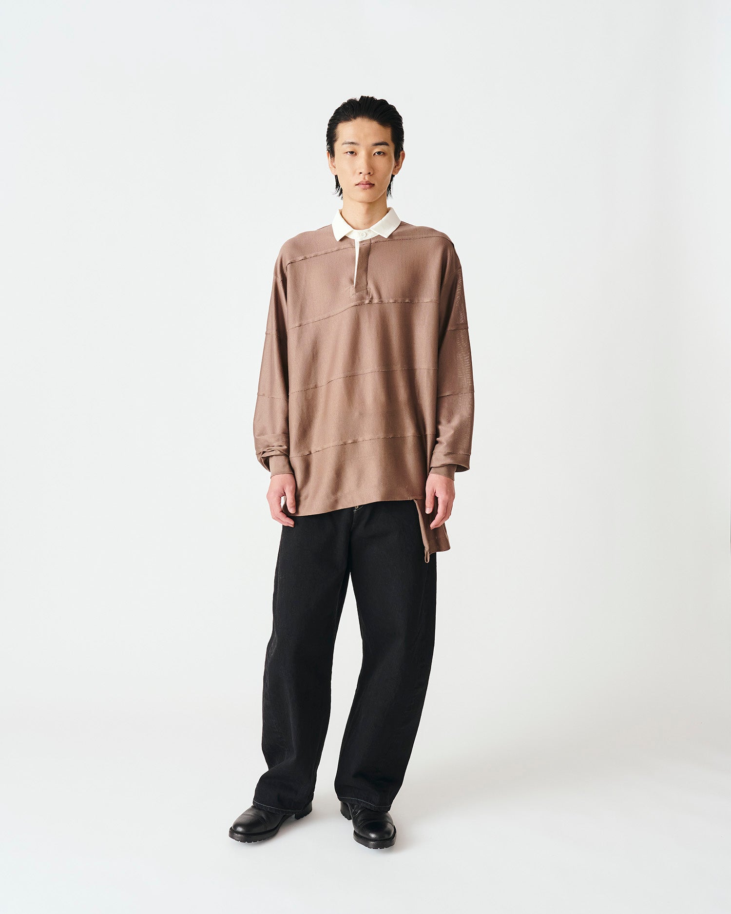 帯状に体に巻き付け切り替え直線縫い一回で見頃を構成したパターンが特徴のデザインです。衿はシャツ地を使用し、ラガーシャツらしいテープ仕様の前開きを採用しています。